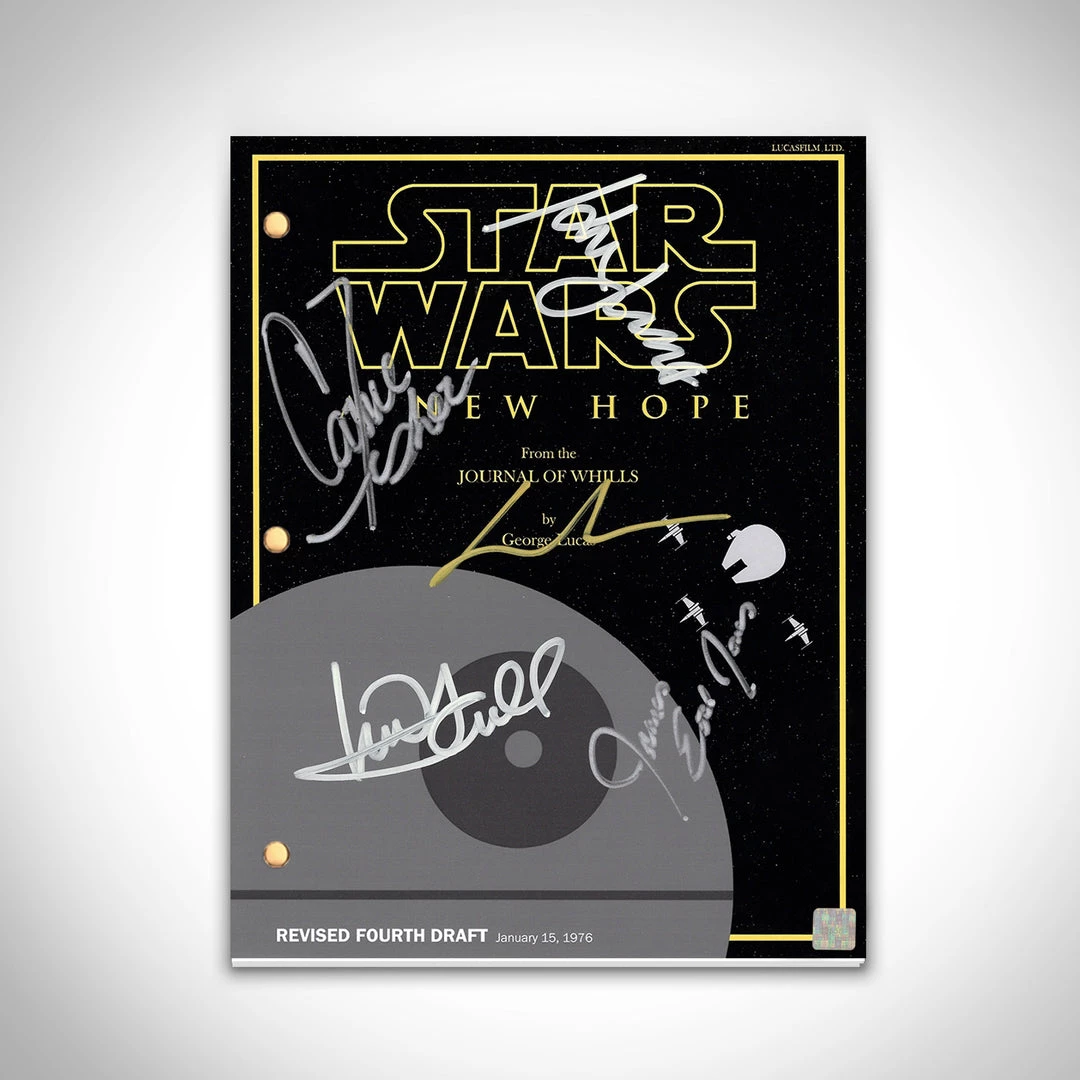 Pay homage to Star Wars a New Hope , with this Lucasfilm  fully licensed facsimile of the official signed movie script, originally signed by actors Mark Hamill, Harrison Ford, James Earl Jones, writer/director George Lucas & the late, great Carrie Fisher , of which is strictly limited to 100 units Worldwide and has been approved and numbered accordingly.