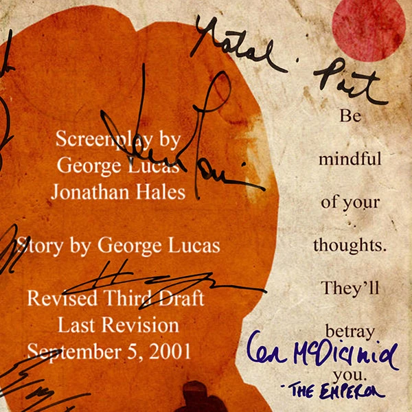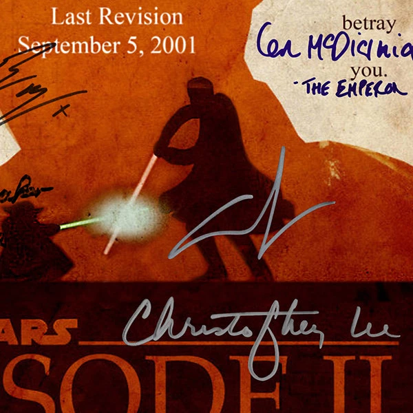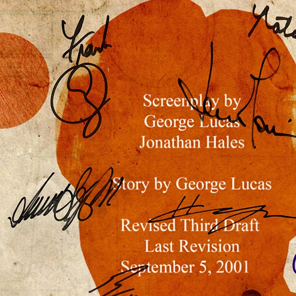 Pay homage to Star Wars Episode 2 Attack of the clones , with this Lucasfilm fully licensed facsimile of the official signed movie script, originally signed by actors George Lucas, Ewan McGregor, Natalie Portman, Hayden Christensen, Christopher Lee, Samuel L.Jackson, Frank Oz, Ian McDiarmid, Temuera Morrison & Kenny Baker , of which is strictly limited to 100 units Worldwide and has been approved and numbered accordingly.