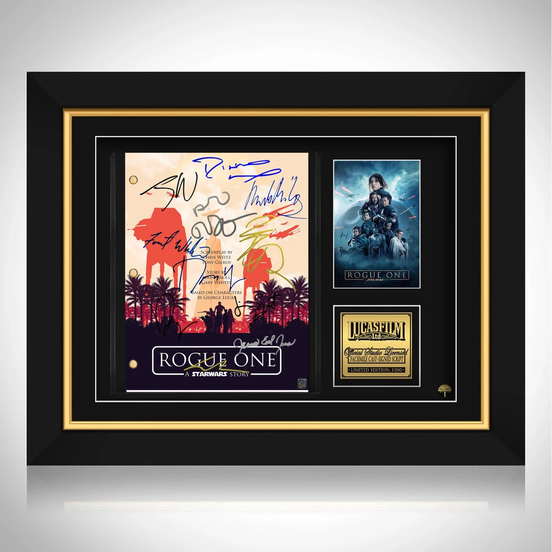 Pay homage to Star Wars Rogue One , with this Lucasfilms fully licensed facsimile of the official signed movie script, originally signed by actors Felicity Jones, Diego Luna, Alan Tudyk, Donnie Yen, Wen Jiang, Forest Whitaker, Mads Mikkelsen, Jimmy Smits, James Earl Jones & George Lucas , of which is strictly limited to 100 units Worldwide and has been approved and numbered accordingly.