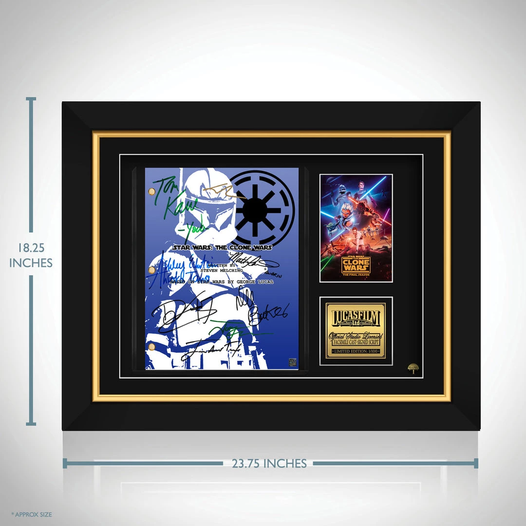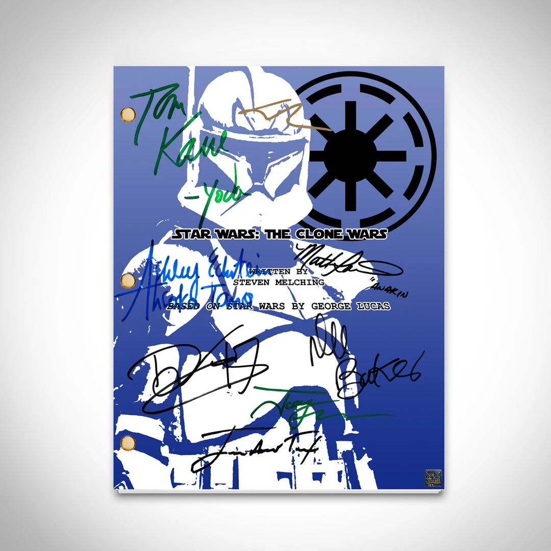 Pay homage to Star Wars The Clone Wars , with this Lucasfilm ย fully licensed facsimile of the official signed movie script, originally signed by actors Matt Lanter, James Arnold Taylor, Ashley Eckstein, Tom Kane, Dee Bradley Baker, Jon Favreau, creator George Lucas & director Dave Filoni , of which is strictly limited to 100 units Worldwide and has been approved and numbered accordingly.
