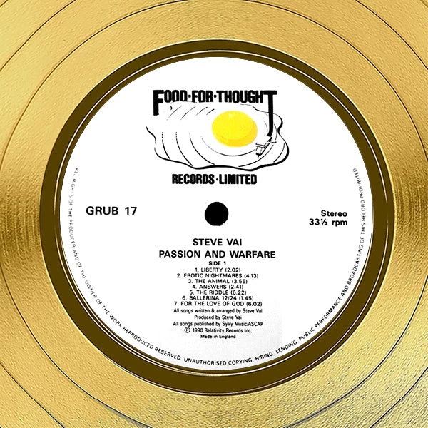 Pay homage to one of the most iconic American guitarist, composer, singer, songwriter of all time Steve Vai , with this gallery-framed, authentic Food for Thought Records fully licensed facsimile of the official Hand-Signed 24K Gold LP Record and LP Cover Passion and Warfare Originally signed by Steve Vai , of which is strictly limited to 100 units Worldwide and has been approved and numbered accordingly.