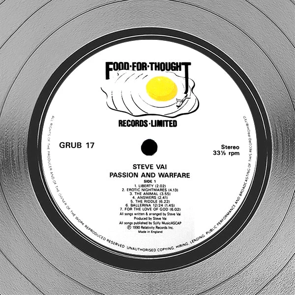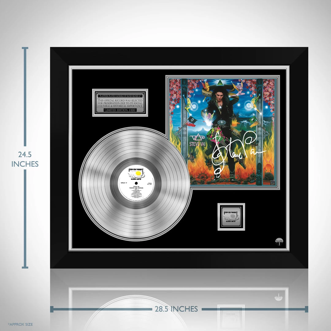 Pay homage to one of the most iconic American guitarist, composer, singer, songwriter of all time Steve Vai , with this gallery-framed, authentic Food for Thought Records fully licensed facsimile of the official Hand-Signed Platinum Plated LP Record and LP Cover Passion and Warfare Originally signed by Steve Vai , of which is strictly limited to 100 units Worldwide and has been approved and numbered accordingly.