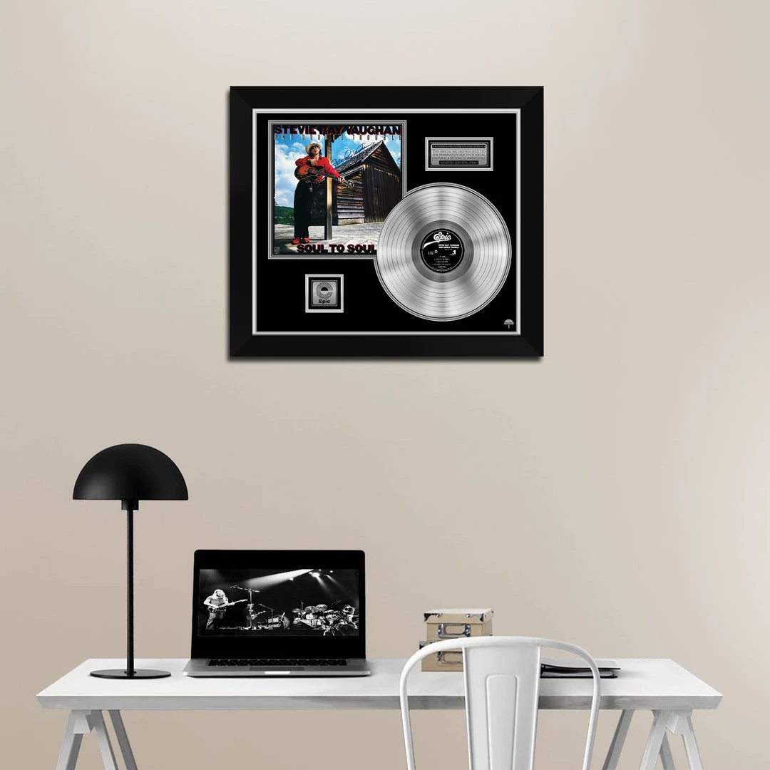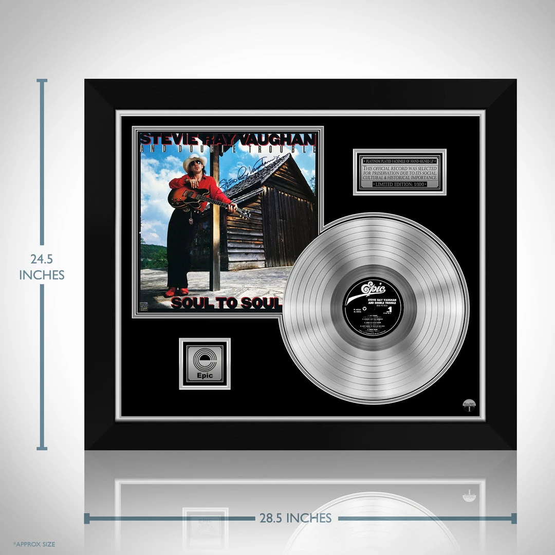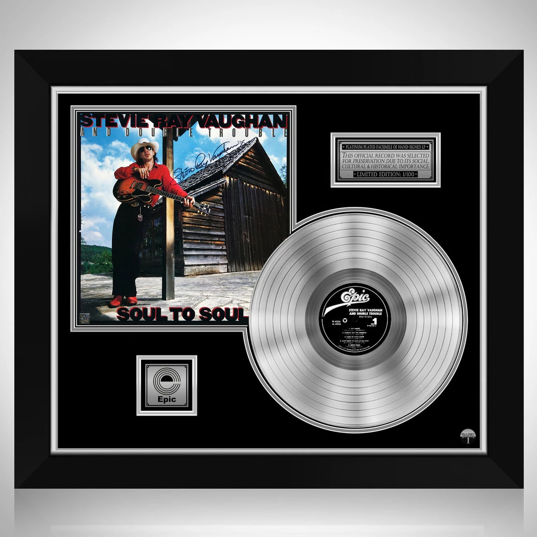 Pay homage to one of the greatest guitar players of all time, Stevie Ray Vaughan, with this gallery-framed, authentic, Epic Records fully licensed facsimile of the official Hand-Signed Platinum Plated LP Record and LP Cover Soul to Soul originally signed by the legendary late, great Stevie Ray Vaughan,, of which is strictly limited to 100 units Worldwide and has been approved and numbered accordingly.