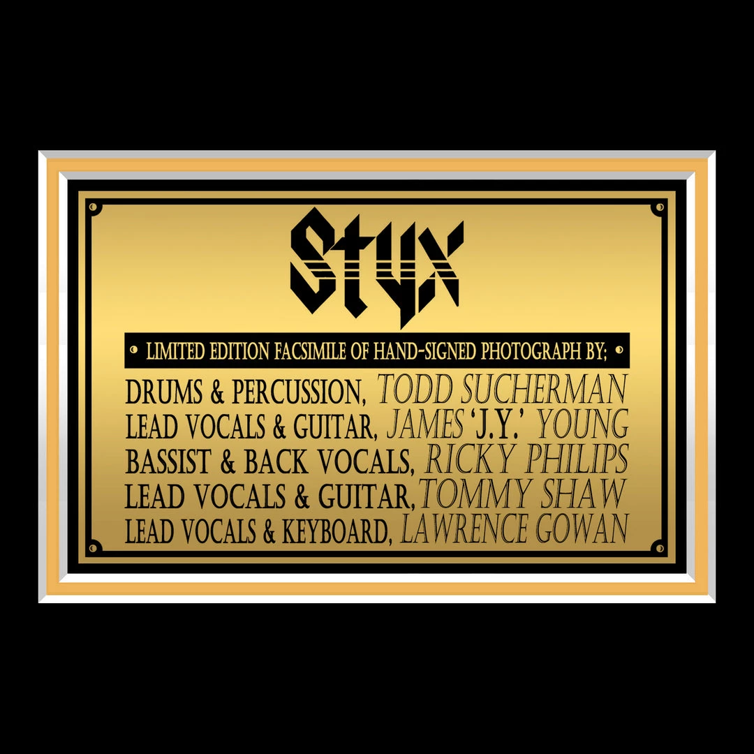 Pay homage to Styx , with this gallery-framed, officially licensed, limited edition facsimile of hand-signed photo, originally signed by Todd Sucherman, James Young, Ricky Philips, Tommy Shaw & Lawrence Gowan, of which is strictly limited to 100 units Worldwide, and has been approved and numbered accordingly.