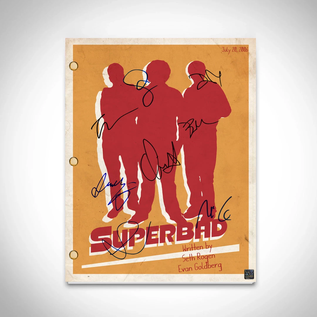 Pay homage to Superbad , with this Columbia Pictures fully licensed facsimile of the official signed movie script, originally signed by actors Seth Rogen, Judd Apatow, Jonah Hill, Michael Cera, Christopher Mintz-Plasse, Bill Hader, Emma Stone & Danny McBride , of which is strictly limited to 100 units Worldwide and has been approved and numbered accordingly.