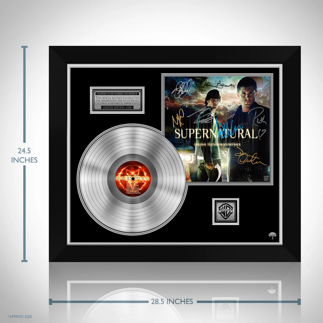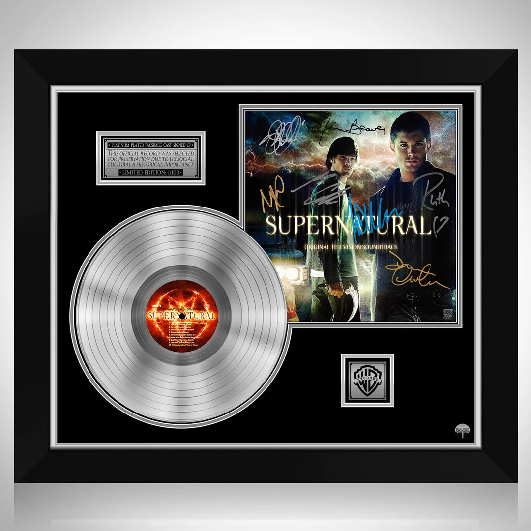 Pay homage to one of the most iconic TV Series of all time Supernatural , with this gallery-framed, authentic Warner Bros. fully licensed facsimile of the official Hand-Signed Platinum Plated LP Record and LP Cover Soundtrack Originally signed by Jared padalecki, Jensen Ackles, Misha Collins, Mark Sheppard, Jim Beaver, Ruth Connell & Jeffrey Dean Morgan , of which is strictly limited to 100 units Worldwide and has been approved and numbered accordingly.