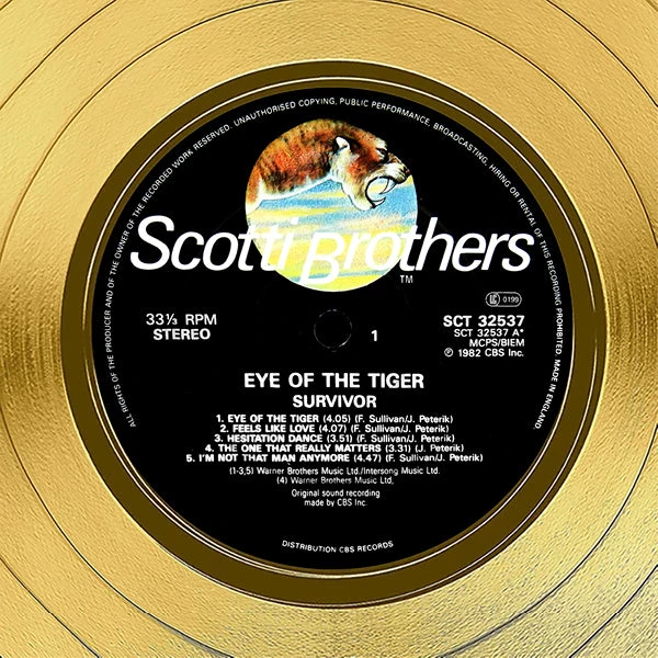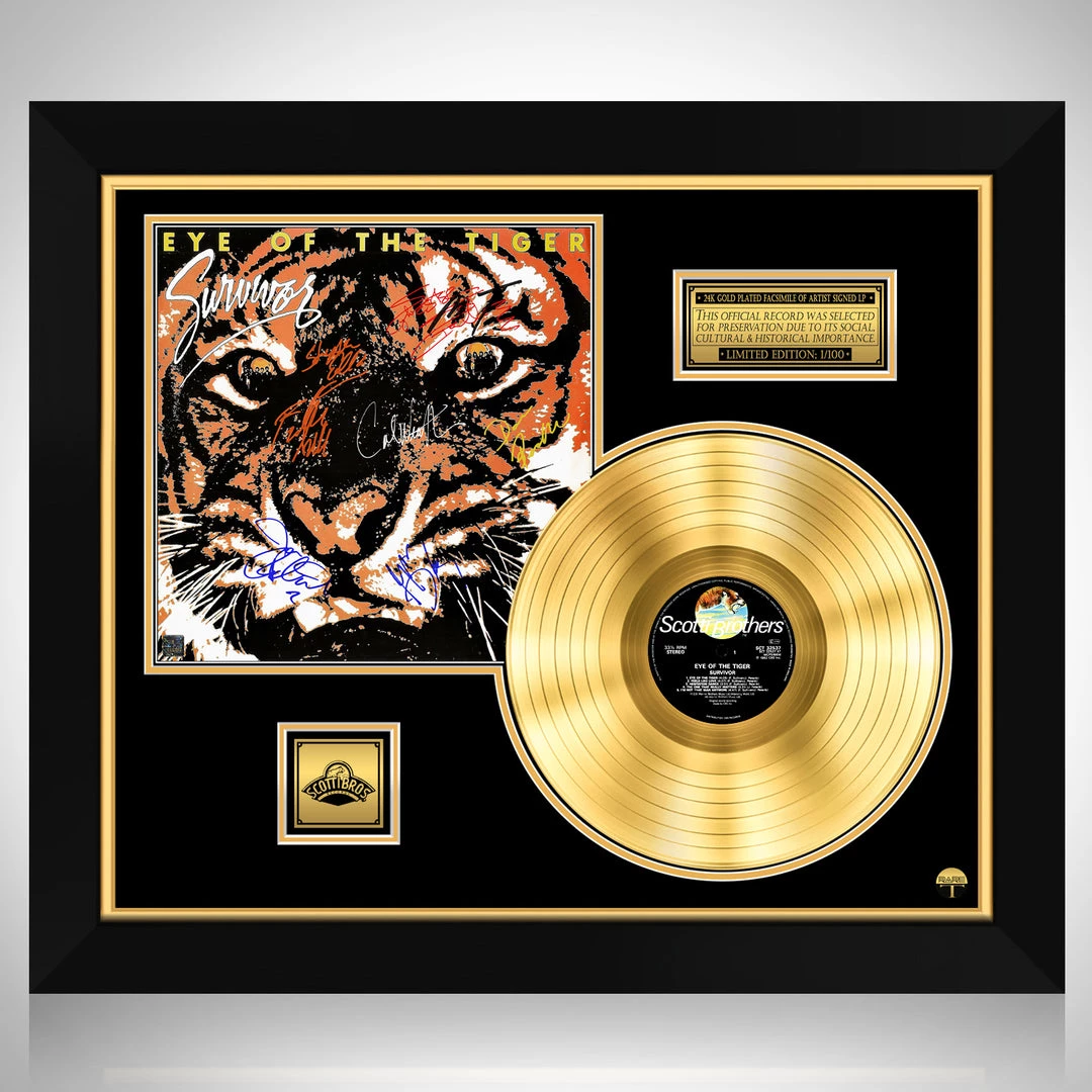 Pay homage to one of the most iconic artists of all time Survivors , with this gallery-framed, authentic Scotti Bros. Records fully licensed facsimile of the official Hand-Signed 24K Gold LP Record and LP Cover The Eye of the Tiger Originally signed by Sylvester Stallone, Mr.T , Carl Weathers, Dave Bickler, Jim Peterik, Frankie Sullivan, Stephan Ellis & Marc Droubay , of which is strictly limited to 100 units Worldwide and has been approved and numbered accordingly.