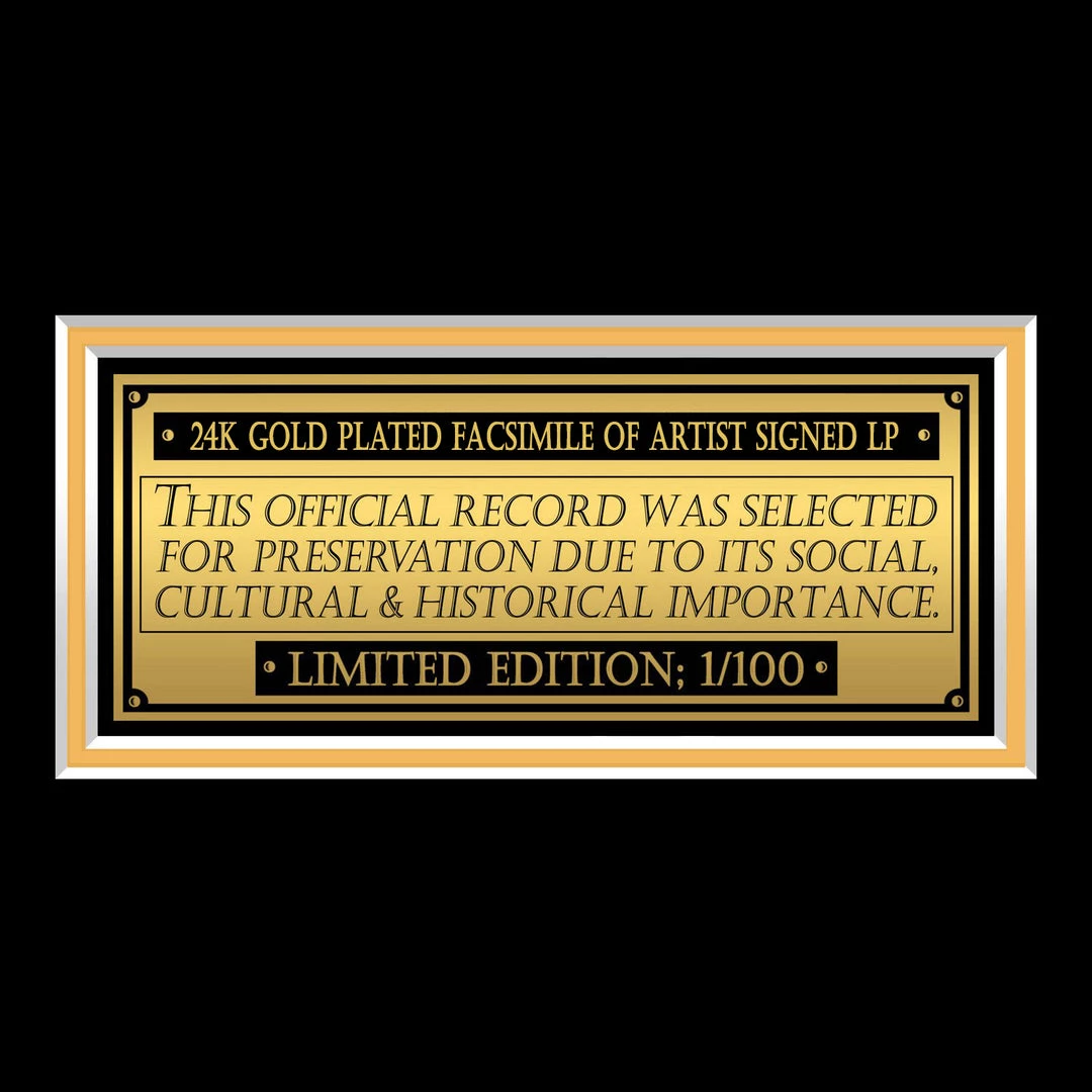 The 24K Gold LP and album cover facsimile are both professionally mounted in the highest quality triple matted wood shadow box frame with metallic fillet trim and finished with protective glass to keep it looking pristine. The customized descriptive metallic plaque, in addition to the detailed finishing and openings, add to the elegant and sophisticated gallery quality look.