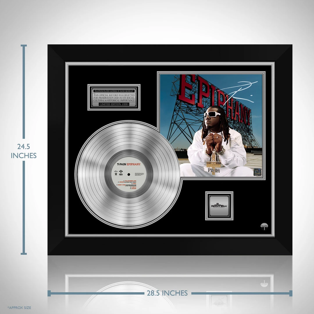 Pay homage to one of the most iconic rapper of all time T-Pain , with this gallery-framed, authentic Nappy boy entertainment fully licensed facsimile of the official Hand-Signed Platinum Plated LP Record and LP Cover Epiphany Originally signed by T-Pain , of which is strictly limited to 100 units Worldwide and has been approved and numbered accordingly.