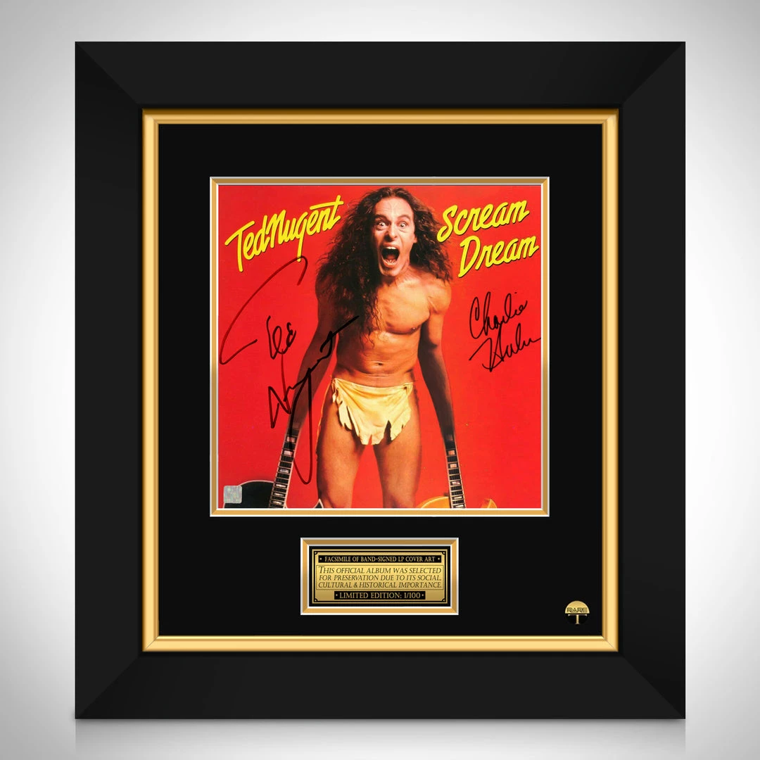 Pay homage to one of the greatest guitar players & Singers of all time, Ted Nugent, with this gallery-framed, officially licensed, limited edition facsimile of the Hand-Signed, Scream Dream LP Cover originally signed by Ted Nugent & Charlie Huhn, of which is strictly limited to 100 units Worldwide, and has been approved and numbered accordingly.