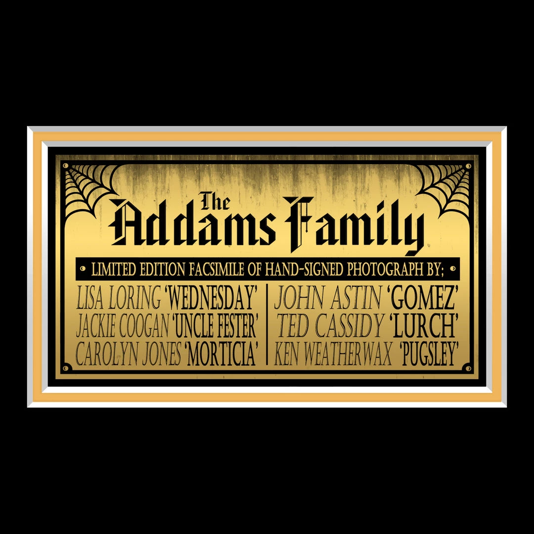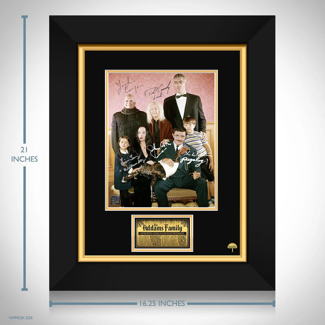 Pay homage to The Addams Family, with this gallery-framed, officially licensed, limited edition facsimile of the Hand-Signed photo, originally signed by Lisa Loring, Jackie Coogan, Carolyn Jones, Marie Blake, John Astin, Ted Cassidy & Ken Weatherwax, of which is strictly limited to 100 units Worldwide, and has been approved and numbered accordingly.
