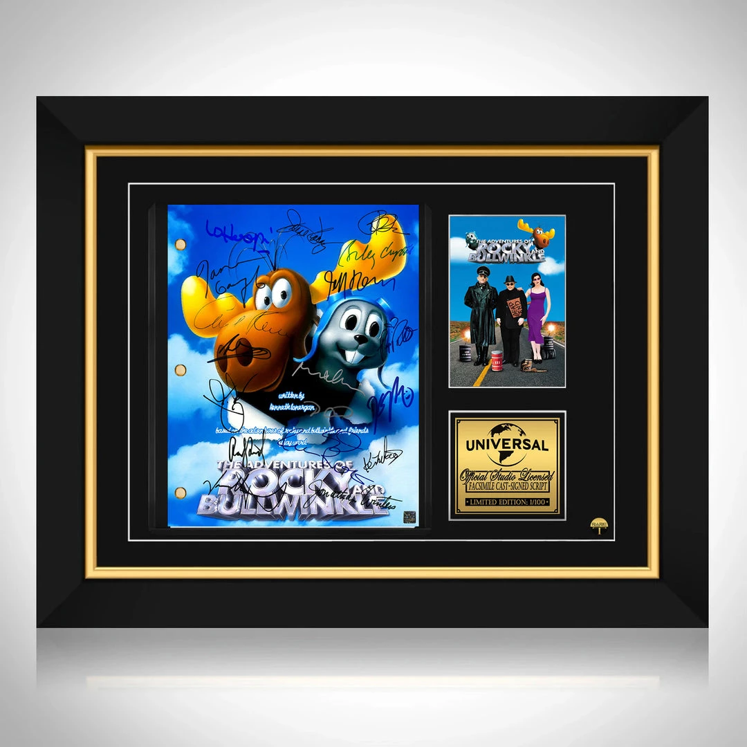 Pay homage to the Adventures of Rocky and Bullwinkle , with this Universal Pictures fully licensed facsimile of the official signed movie script, originally signed by actors Robert De Niro, Rene Russo, Jason Alexander, Randy Quaid, Kel Mitchell, Kenan Thompson, Piper Perabo, June Foray, Keith Scott, Jeneane Garofalo, Carl Reiner, Jonathan Winters, John Goodman, David Alan Grier, Phil Proctor, Jeff Ross, Billy Crystal & Whoopi Goldberg , of which is strictly limited to 100 units Worldwide and has been approved and numbered accordingly.