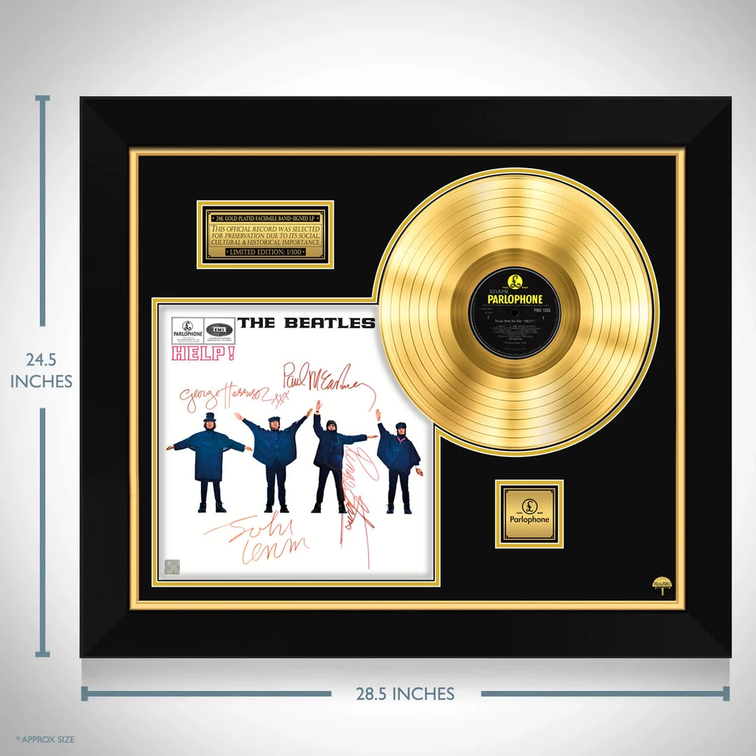 Pay homage to one of the best and most influential Bands of all time The Beatles, with this gallery-framed, authentic, Parlophone Records fully licensed facsimile of the official Hand-Signed 24k Gold Plated LP Record and LP Cover Help, originally signed by Paul McCartney, Ringo Starr, the late George Harrison and John Lennon. of which is strictly limited to 100 units Worldwide and has been approved and numbered accordingly.