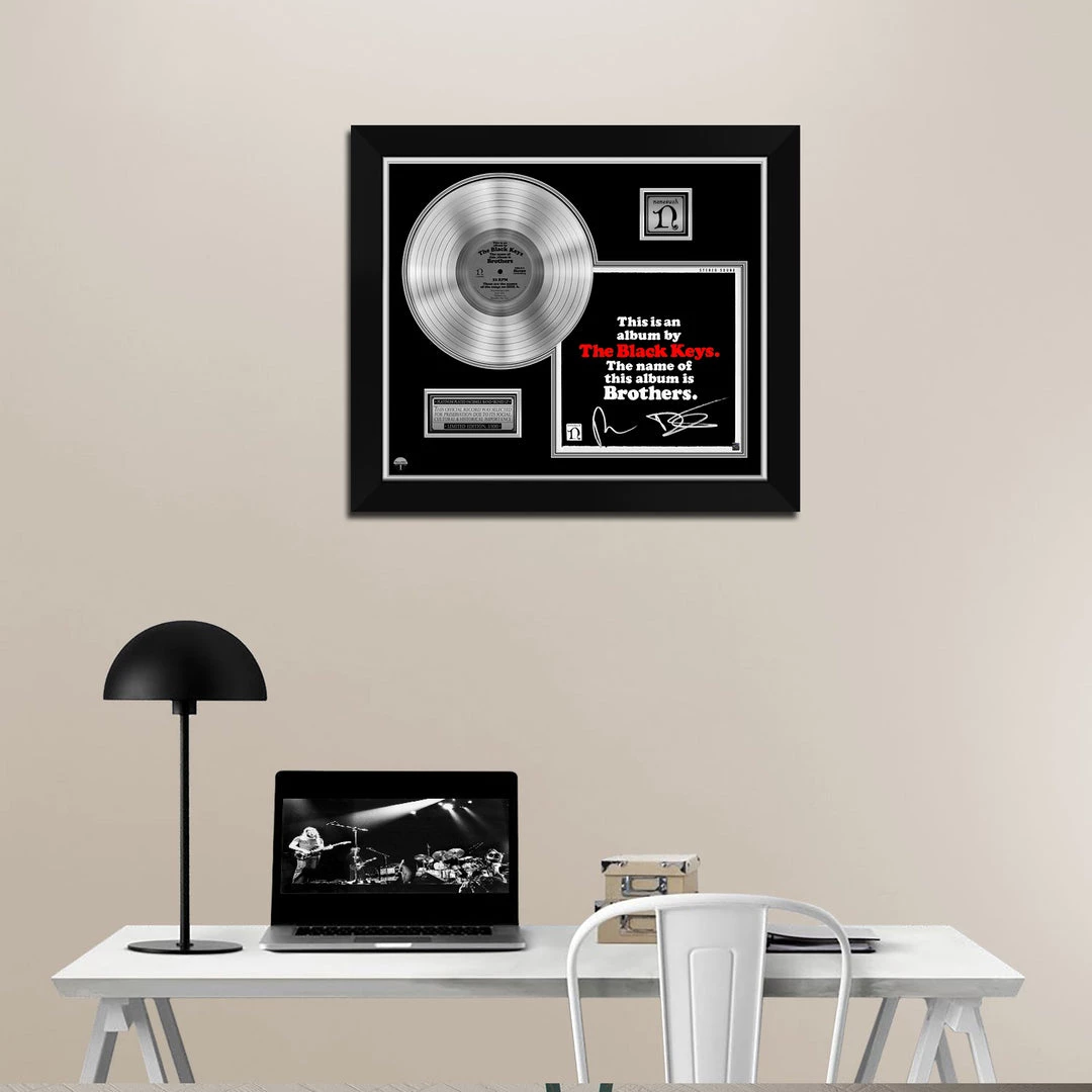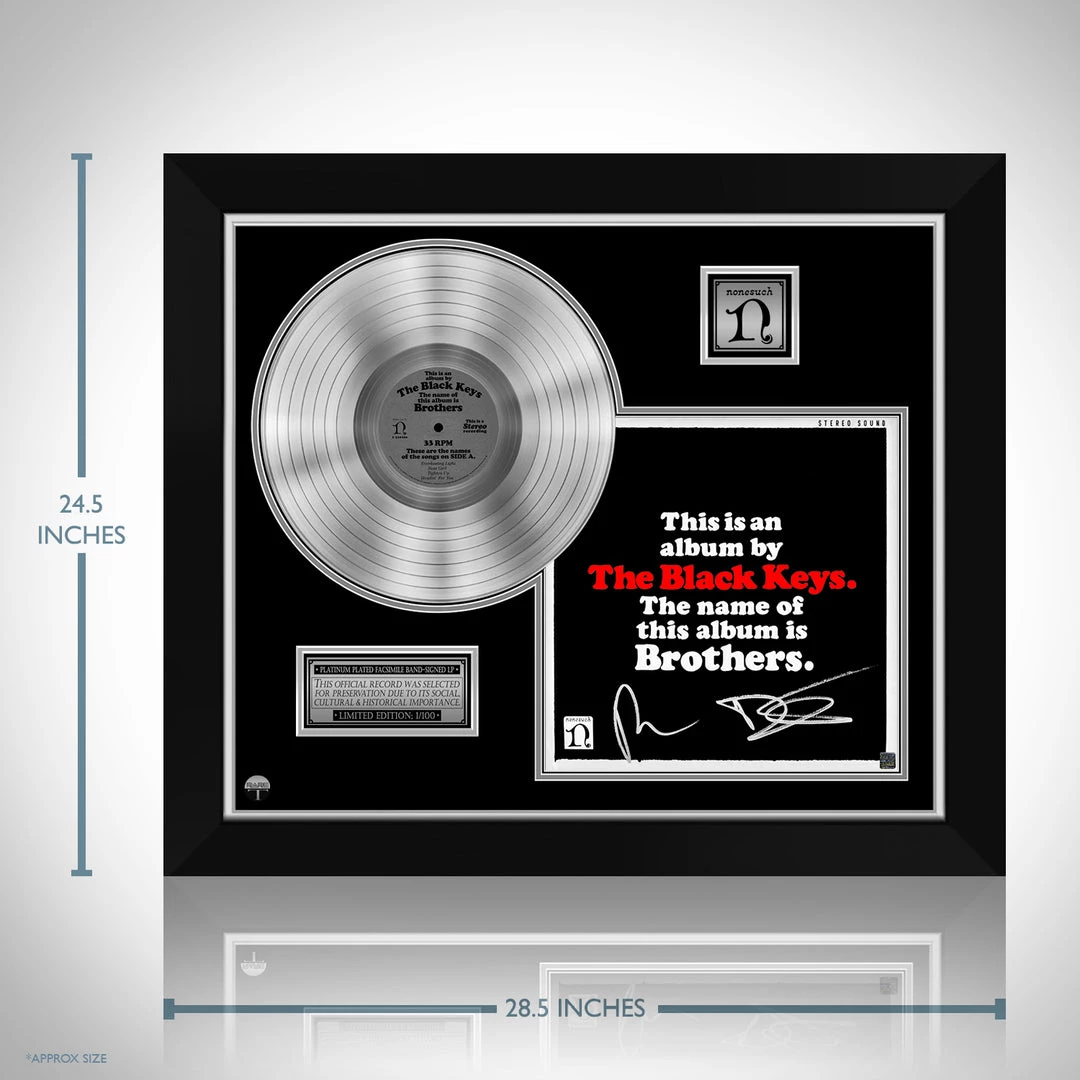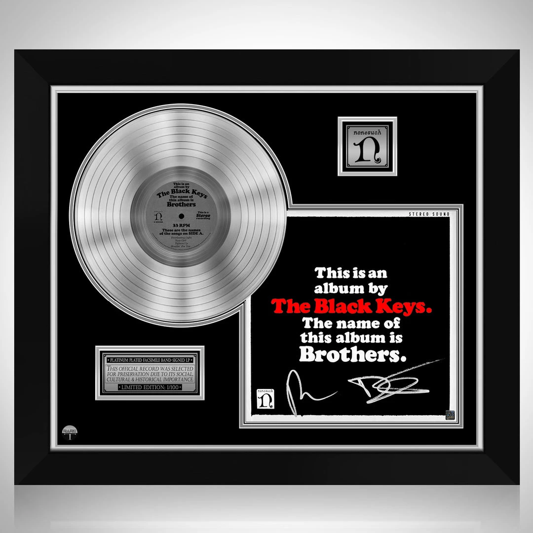 Pay homage to one of the most iconic American rock band of all time The Black Keys , with this gallery-framed, authentic Nonesuch records fully licensed facsimile of the official Hand-Signed Platinum Plated LP Record and LP Cover Brothers Originally signed by Dan Auerbach & Patrick Carney , of which is strictly limited to 100 units Worldwide and has been approved and numbered accordingly.