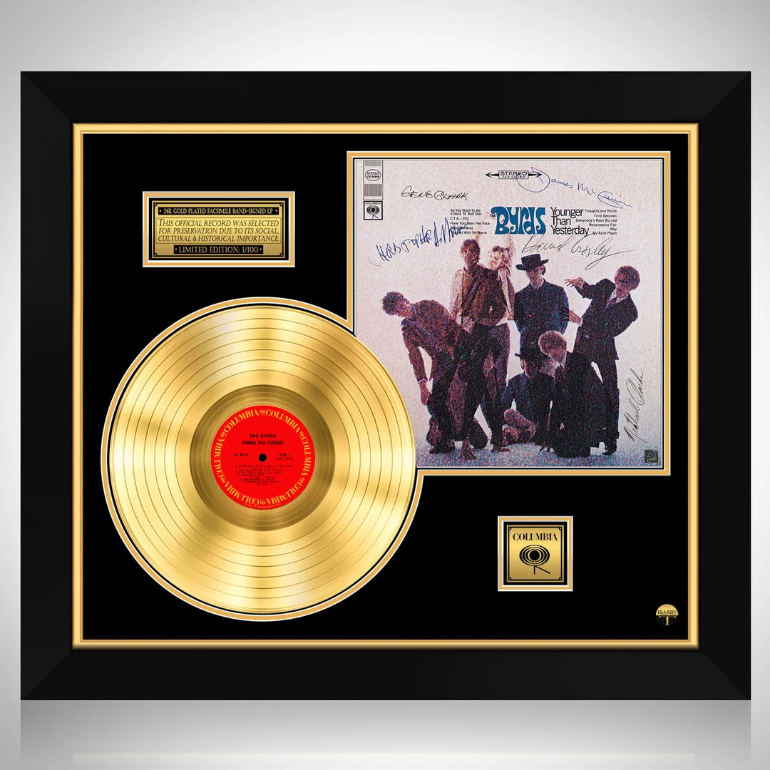 Pay homage to one of the most iconic American rock band of all time The Byrds , with this gallery-framed, authentic Columbia Records fully licensed facsimile of the official Hand-Signed 24K Gold LP Record and LP Cover Younger Than Yesterday Originally signed by James McGwinn, Gene Clarke, David Crosby, Michael Clarke & Christopher Hillman , of which is strictly limited to 100 units Worldwide and has been approved and numbered accordingly.