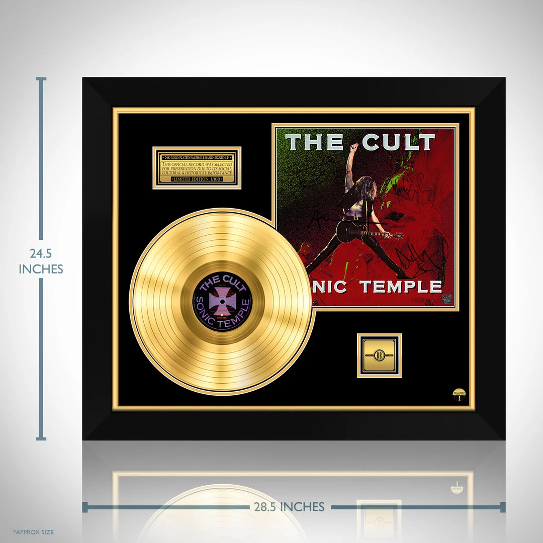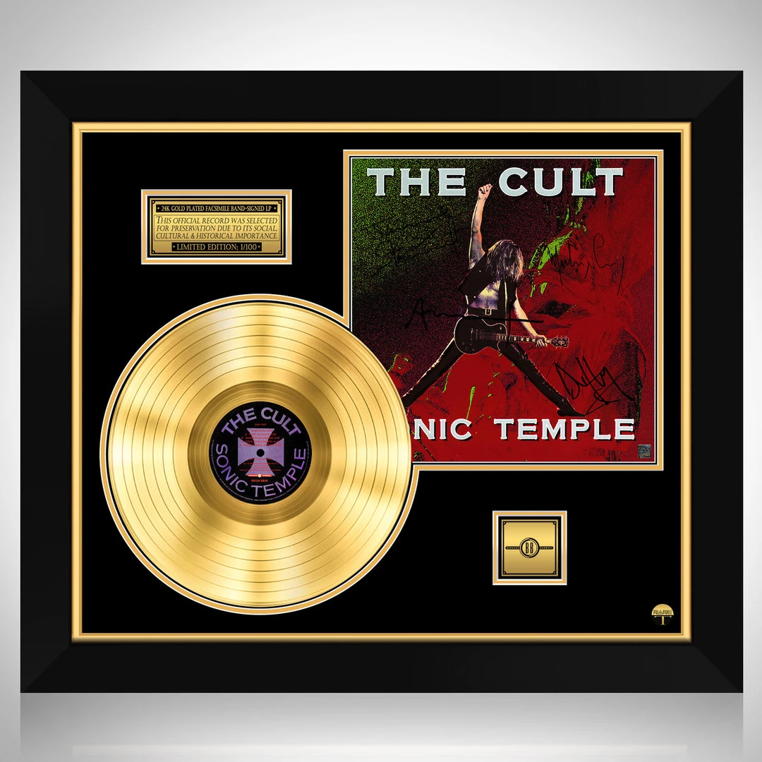 Pay homage to one of the most iconic American stand-up comedian of all time The Cult , with this gallery-framed, authentic Beggars Banquet Records fully licensed facsimile of the official Hand-Signed 24K Gold LP Record and LP Cover Sonic Temple Originally signed by Ian Astbury, Billy Duffy, Jamie Stewart & Mickey Curry , of which is strictly limited to 100 units Worldwide and has been approved and numbered accordingly.