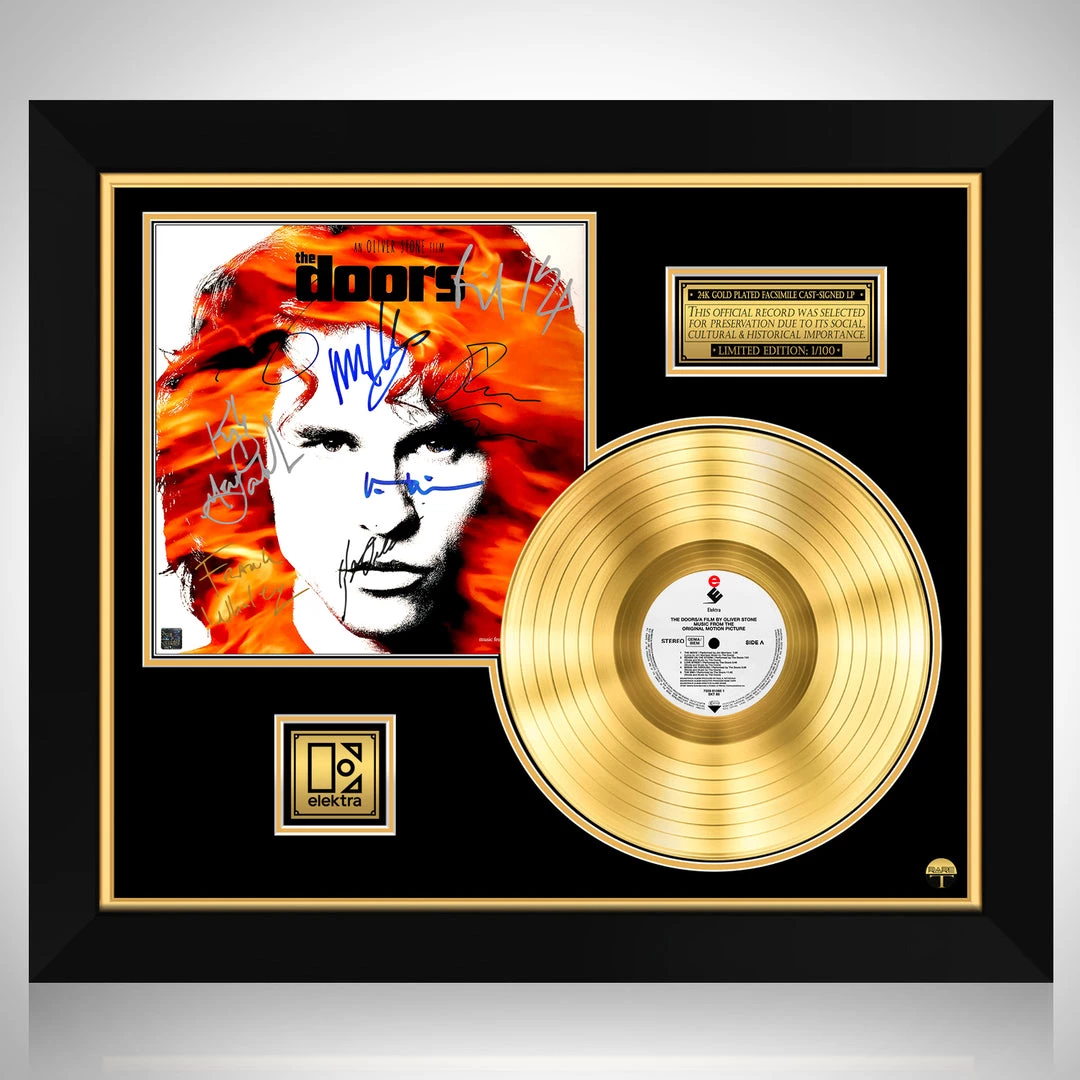Pay homage to one of the most iconic movie of all time The Doors , with this gallery-framed, authentic Elektra Records fully licensed facsimile of the official Hand-Signed 24K Gold LP Record and LP Cover Soundtrack Originally signed by Val Kilmer, Meg Ryan, Kyle MacLachlan, Frank Whaley, Kevin Dillion, Michael Madsen, Billy Idol & Oliver Stone , of which is strictly limited to 100 units Worldwide and has been approved and numbered accordingly.