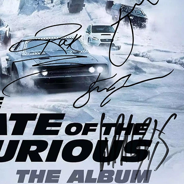 Pay homage to one of the most iconic movie of all time The Fate of the Furious , with this gallery-framed, authentic Universal Records fully licensed facsimile of the official Hand-Signed Platinum Plated LP Record and LP Cover The Album Originally signed by Dwayne the Rock Johnson, Vin Diesel, Jason Statham, Michelle Rodriguez, Tyrese Gibson, Ludacris, Charlize Theron & Kurt Russell , of which is strictly limited to 100 units Worldwide and has been approved and numbered accordingly.