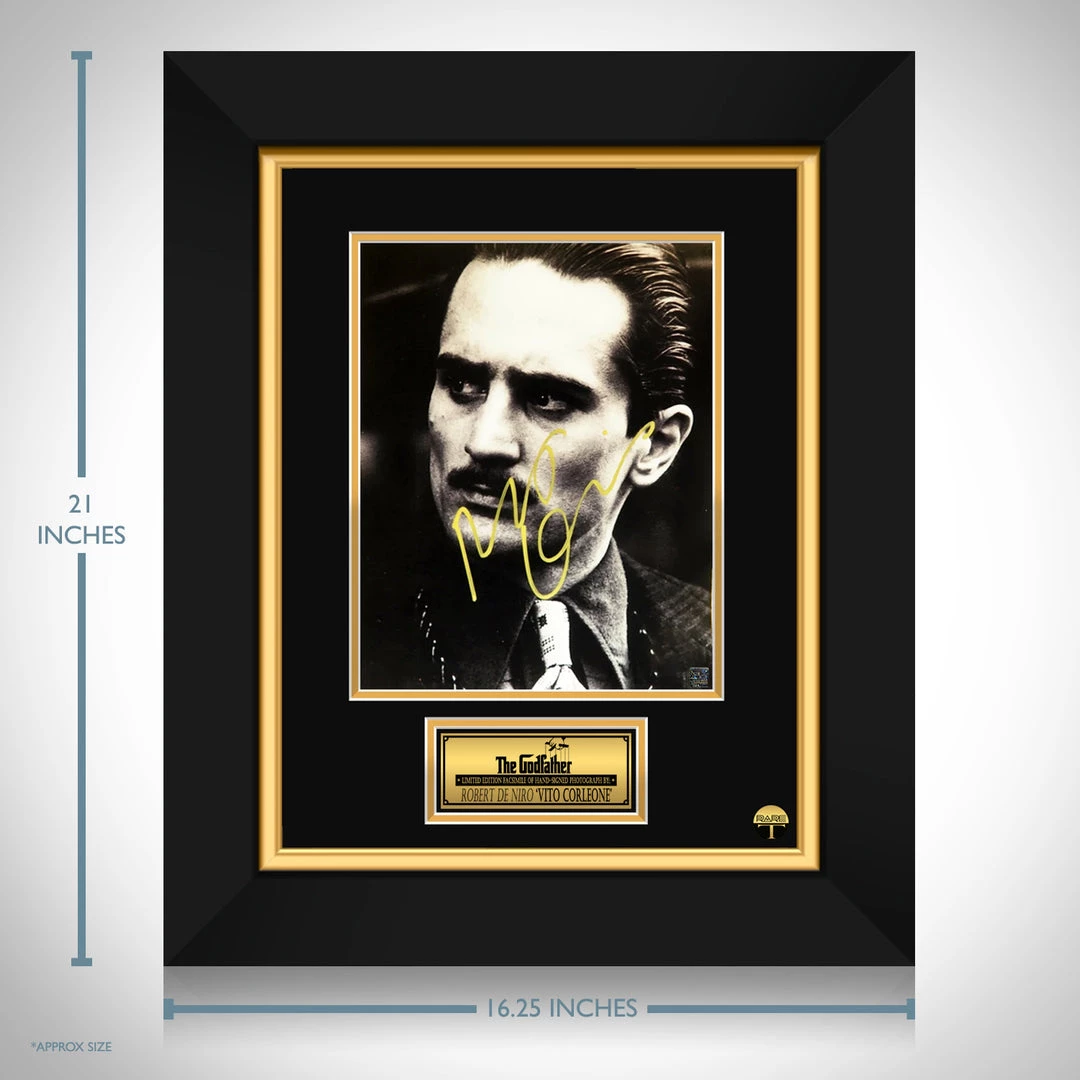 Pay homage to Robert De Niro and the most iconic, multi-generational organized crime saga of all time, The Godfather, with this gallery-framed, officially licensed, limited edition facsimile of the official Hand-Signed movie photo of Young Vito Corleone, originally signed by Robert De Niro, of which is strictly limited to 100 units Worldwide, and has been approved and numbered accordingly.