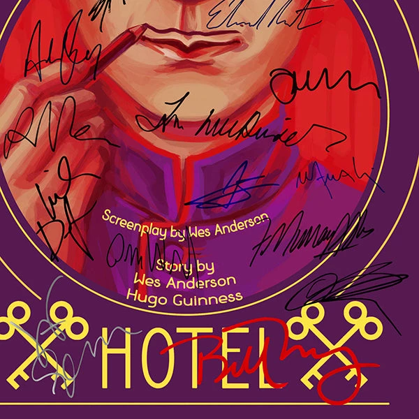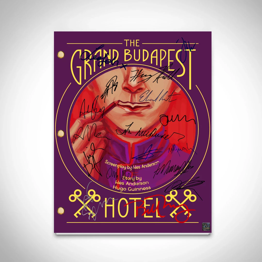 Pay homage to The Grand Budapest Hotel , with this Fox Searchlight Pictures fully licensed facsimile of the official signed movie script, originally signed by actors Ralph Fiennes, F.Murray Abraham, Mathieu Amalric, Adrien Brody, Willem Dafoe, Jeff Goldblum, Harvey Keitel, Jude Law, Bill Murray, Edward Norton, Saoirse Ronan, Jason Schwartzman, Léa Seydoux, Tilda Swinton, Tom Wilkinson, Owen Wilson & Tony Revolori , of which is strictly limited to 100 units Worldwide and has been approved and numbered accordingly.