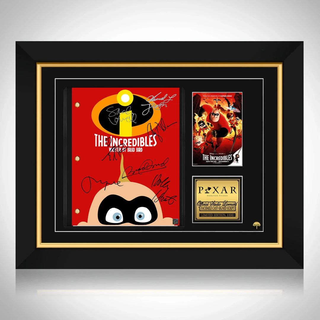 Pay homage to The Incredibles , with this Walt Disney Studios fully licensed facsimile of the official signed movie script, originally signed by actors Craig T. Nelson, Holly Hunter, Samuel L.Jackson, Jason Lee, Sarah Vowell, Elizabeth Peña & Brad Bird , of which is strictly limited to 100 units Worldwide and has been approved and numbered accordingly.
