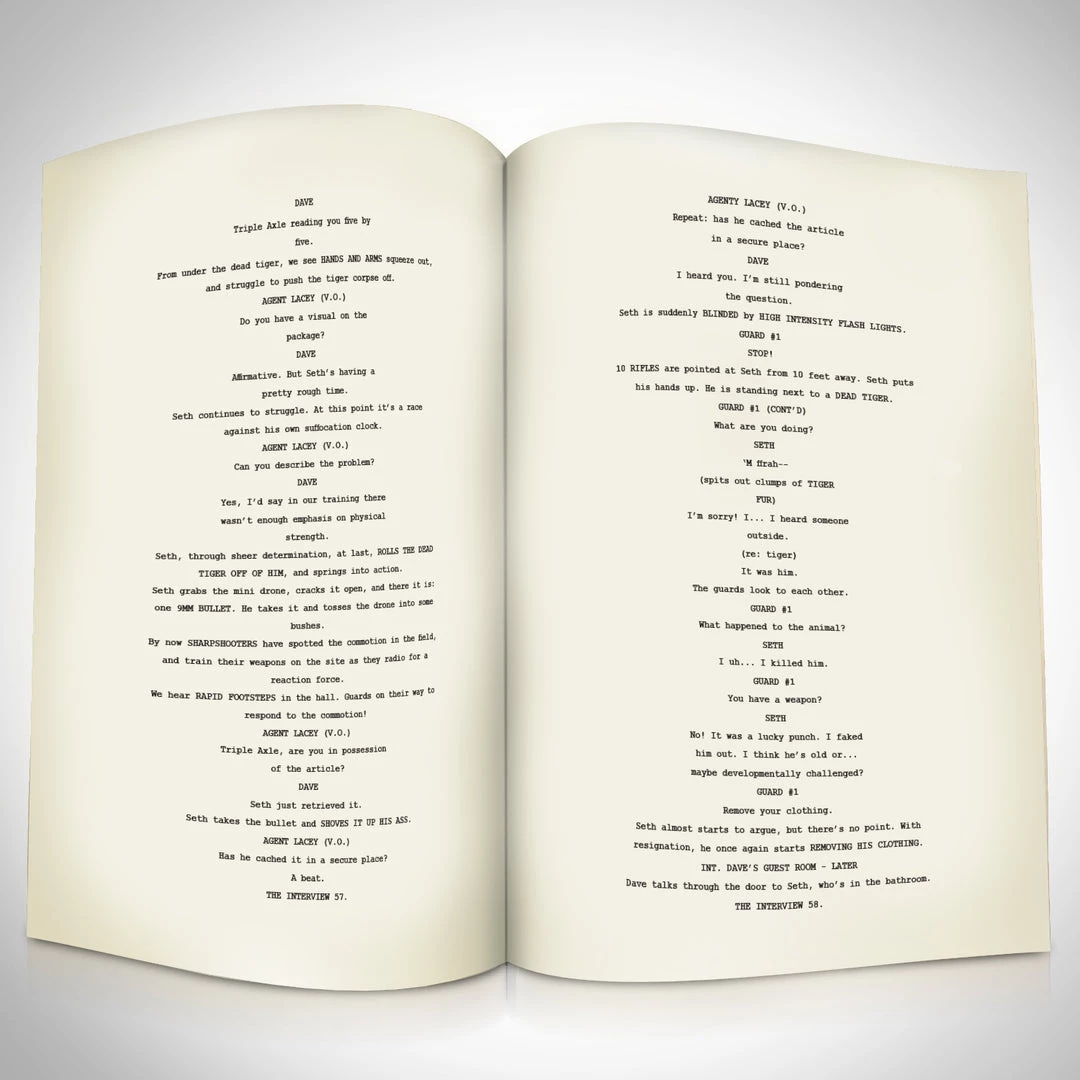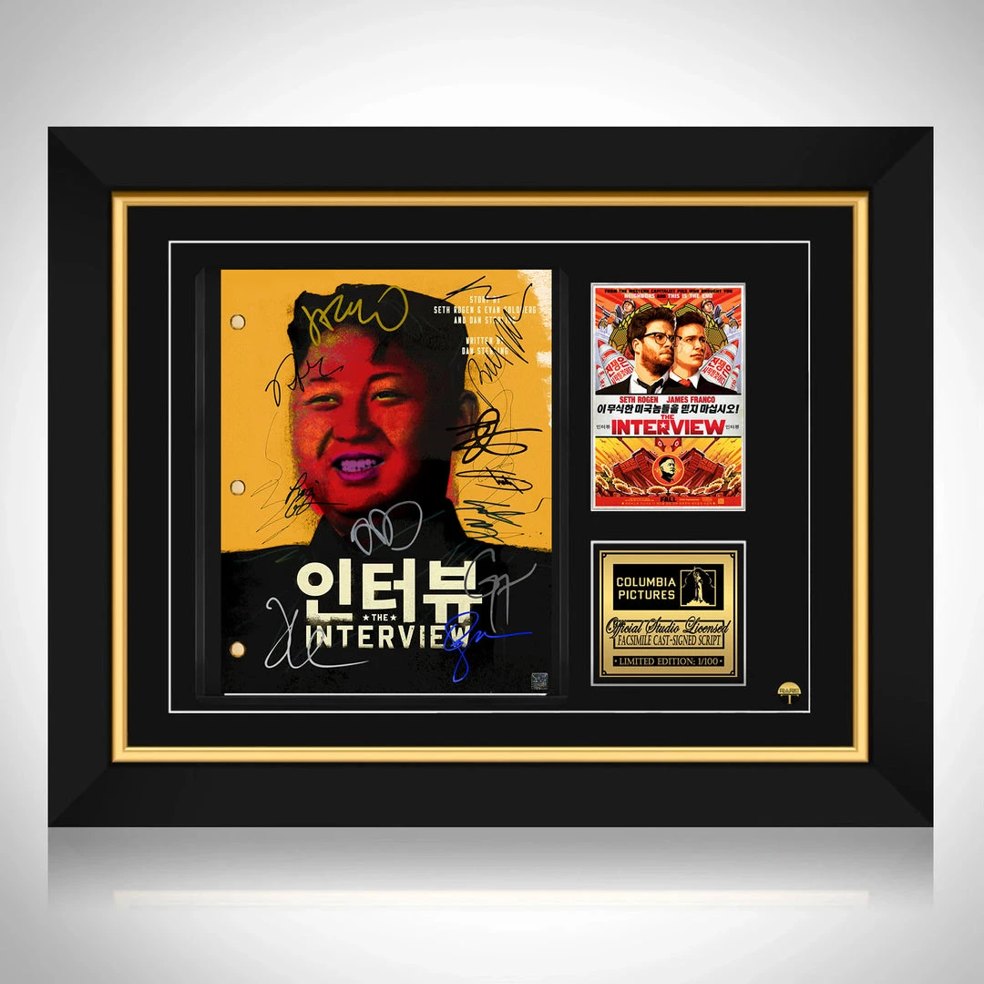 Pay homage to The Interview , with this Columbia Picture fully licensed facsimile of the official signed movie script, originally signed by actors Seth Rogen, James Franco, Lizzy Caplan, Randall Park, Guy Fieri, Ben Schwartz, Eminem, Joseph Gordon-Levitt, Rob Lowe, Bill Maher, Seth Meyers, Emma Stone, , of which is strictly limited to 100 units Worldwide and has been approved and numbered accordingly.