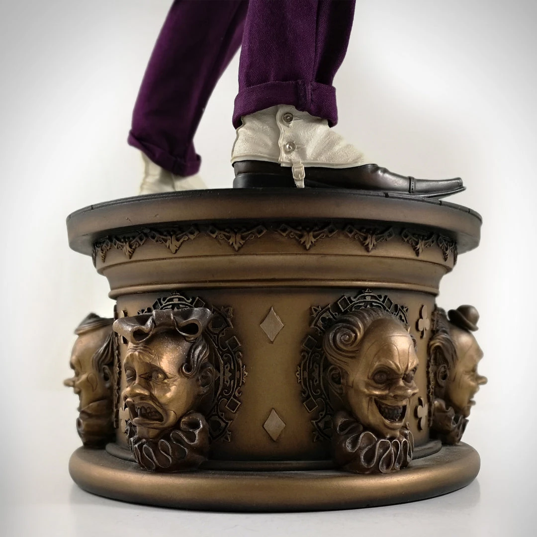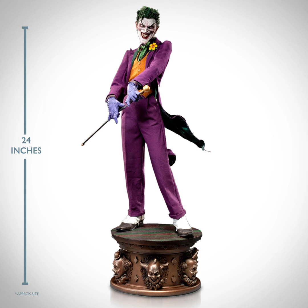 Captured at an impressive 24 inches high in approximately 1/4 scale, with an intricate real fabric costume that features a fully lined topcoat with pose-able tails. The dynamic Joker Premium Format Figure is a fanatically detailed limited edition statue that is fully hand sculpted and hand-painted with incredible details that are jaw dropping. The result is fantastic realism.