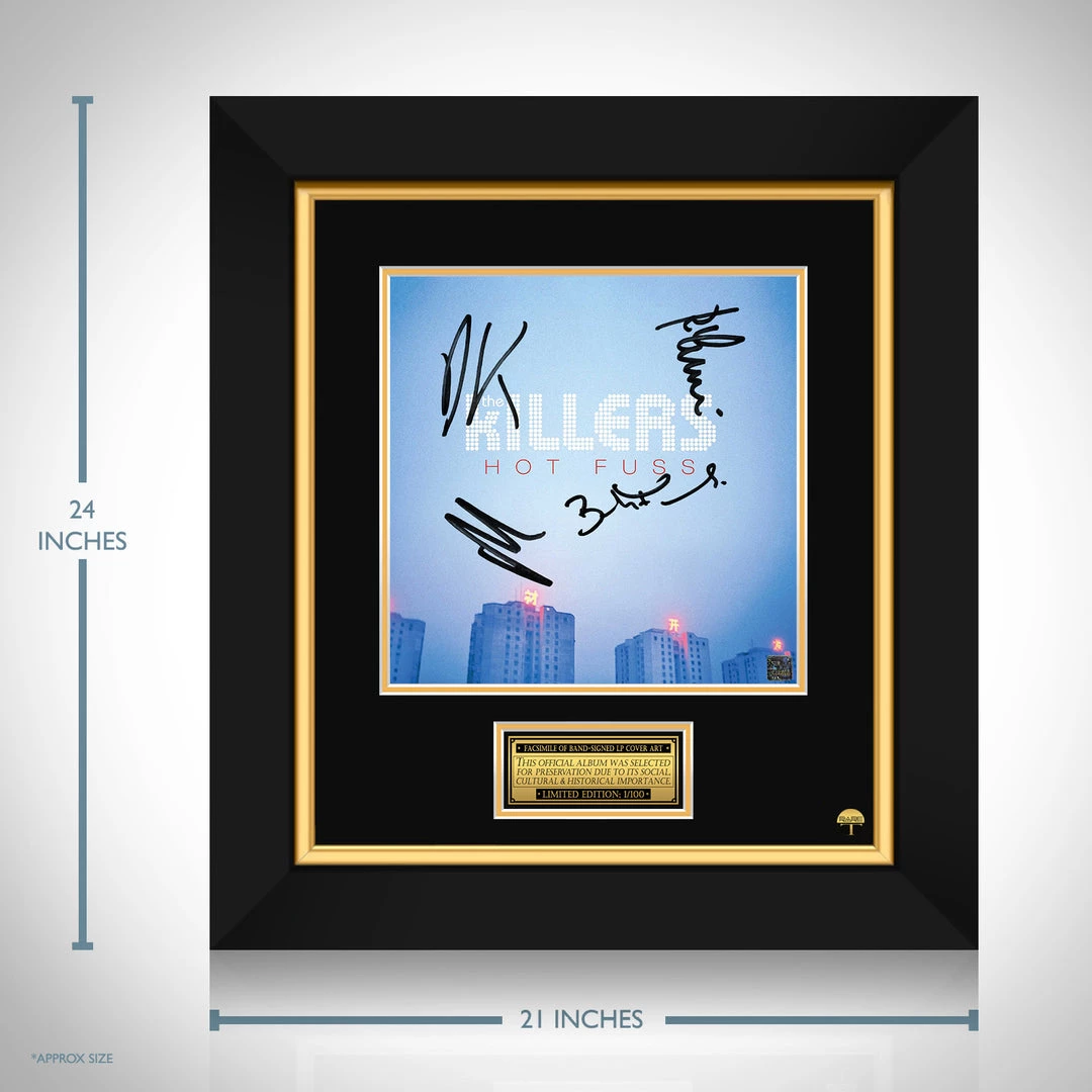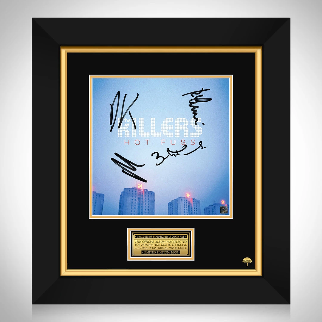 Pay homage to one of the most iconic American rock band of all time, The Killers , with this gallery-framed, officially licensed, limited edition facsimile of the Hand-Signed Hot Fuss LP Cover originally signed by Brandon Flowers, Dave Keuning, Mark Stoermer & Ronnie Vannucci Jr. , of which is strictly limited to 100 units Worldwide, and has been approved and numbered accordingly.