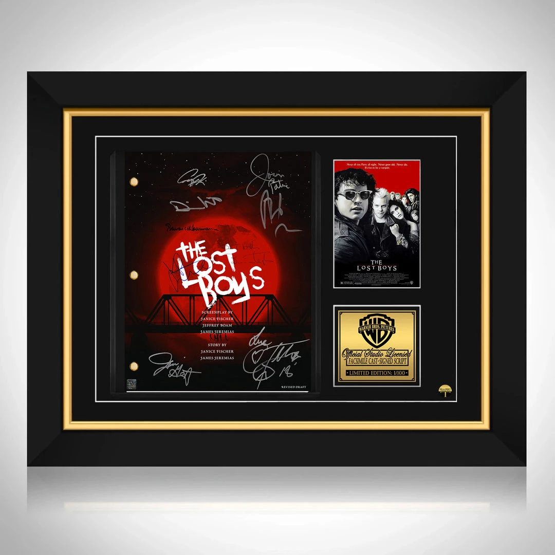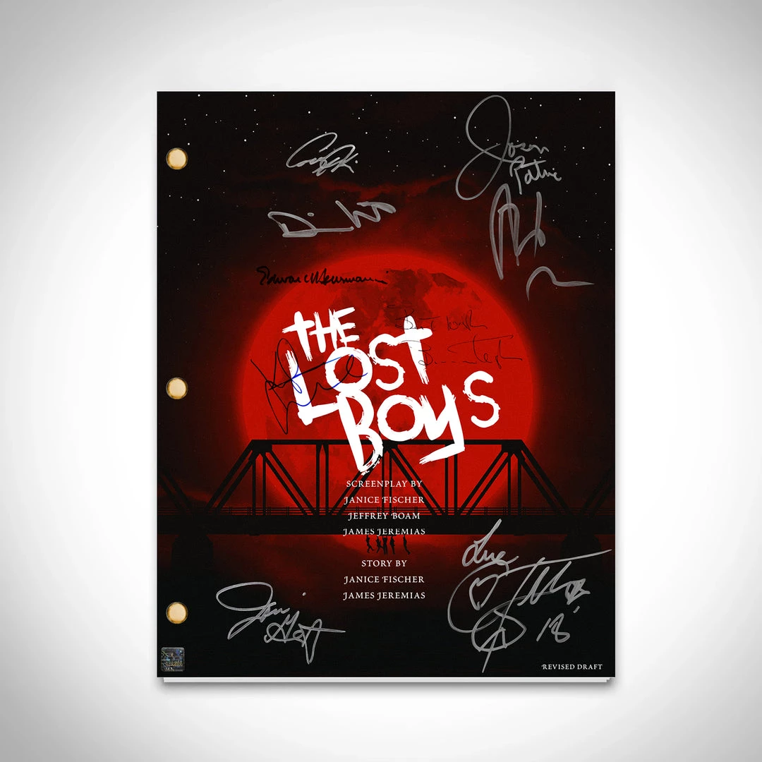 Pay homage to The Lost Boys , with this Warner Bros fully licensed facsimile of the official signed movie script, originally signed by actors Jason Patric, Corey Haim, Dianne West, Barnard Hughes, Edward Herrmann, Kiefer Sutherland, Jami Gertz, Corey Feldman & Alex Winter , of which is strictly limited to 100 units Worldwide and has been approved and numbered accordingly.