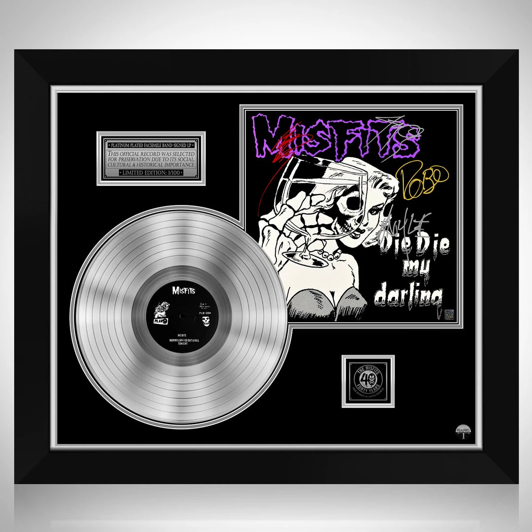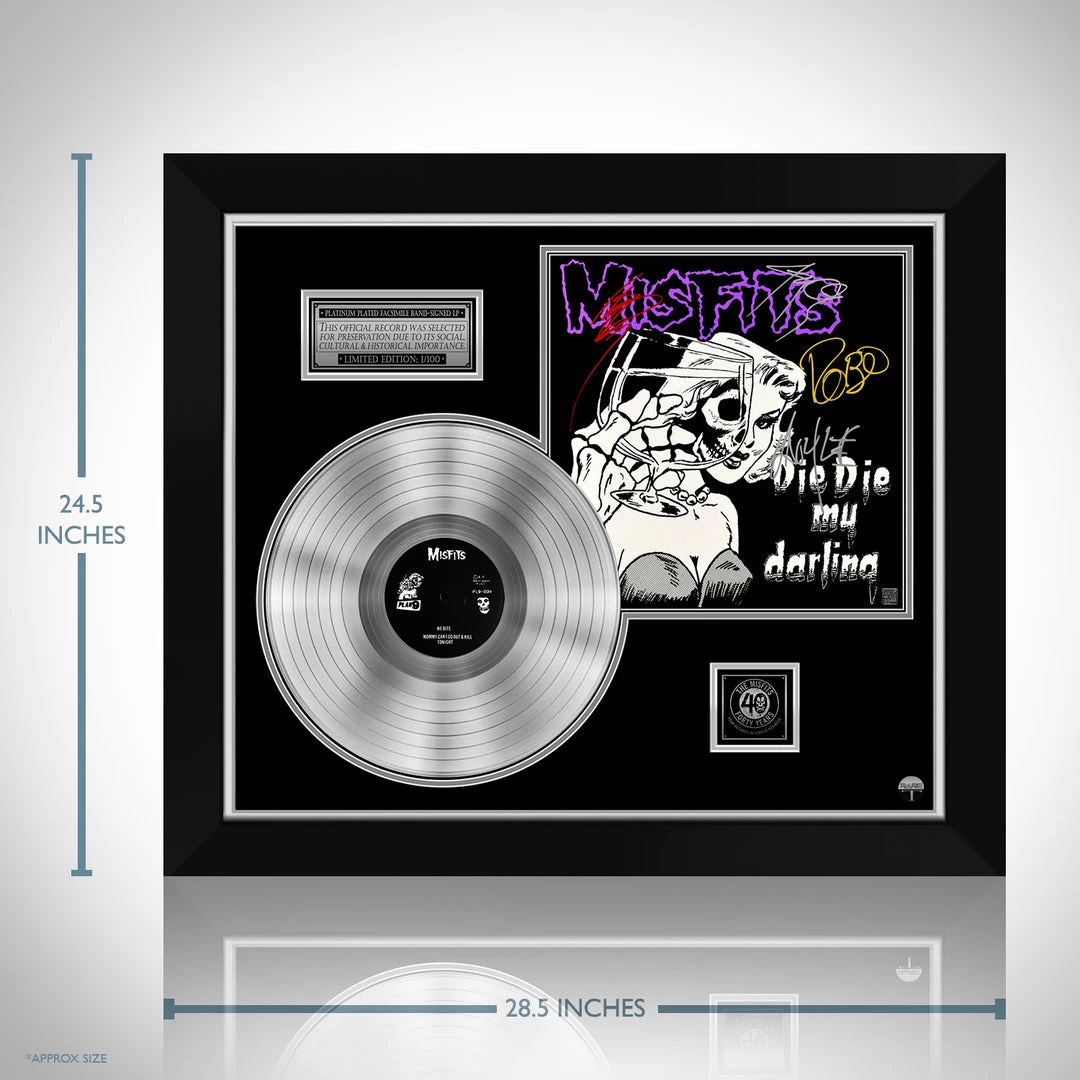 Pay homage to one of the most iconic American punk rock band of all time The Misfits , with this gallery-framed, authentic Plan 9 Records fully licensed facsimile of the official Hand-Signed Platinum Plated LP Record and LP Cover Die Die my darling Originally signed by Glenn Danzig, Doyle, Jerry Only & Robo , of which is strictly limited to 100 units Worldwide and has been approved and numbered accordingly.