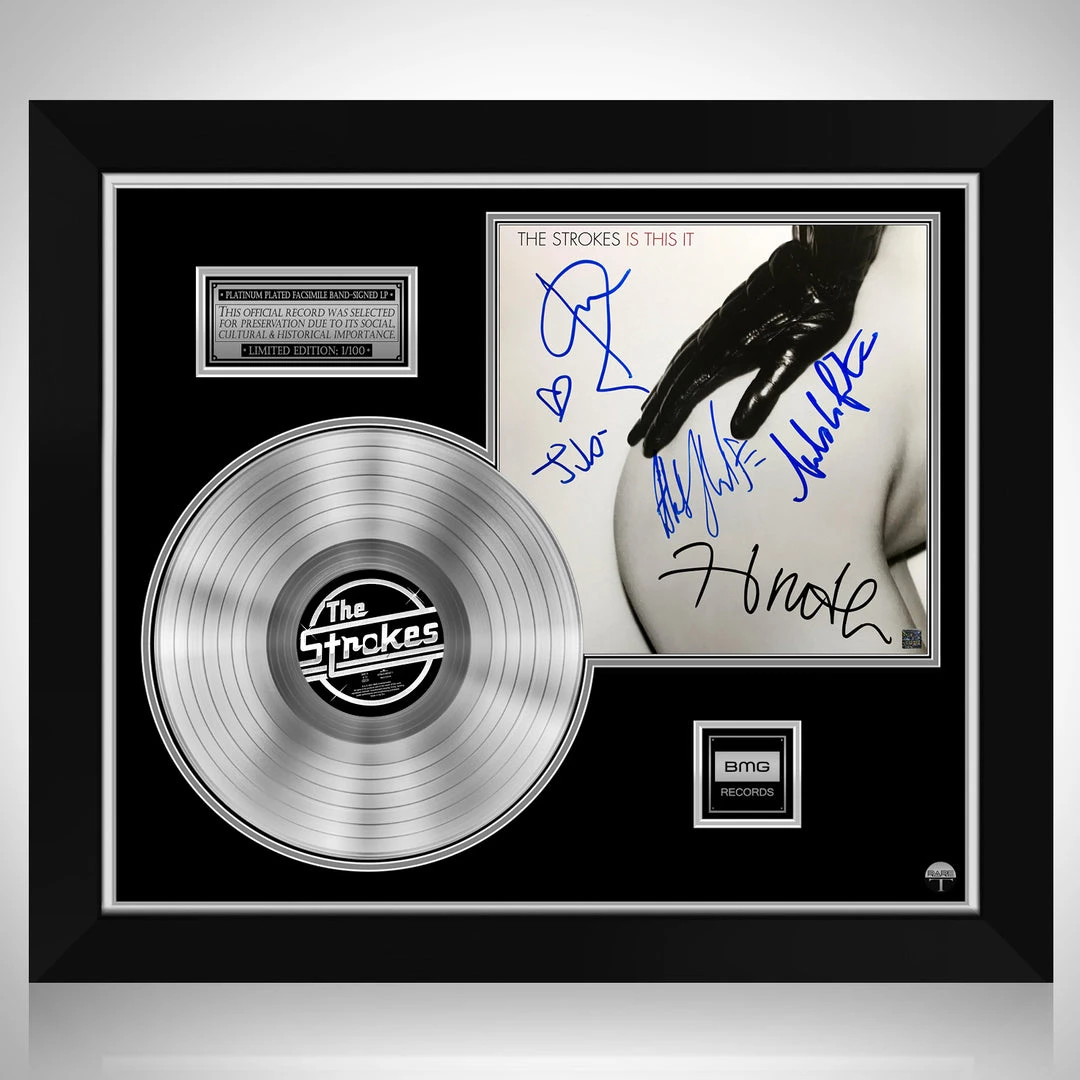Pay homage to one of the most iconic American rock band of all time The Strokes , with this gallery-framed, authentic BMG Records fully licensed facsimile of the official Hand-Signed Platinum Plated LP Record and LP Cover Is this it Originally signed by Julian Casablancas, Nick Valensi, Albert Hammond Jr., Nikolai Fraiture & Fabrizio Moretti , of which is strictly limited to 100 units Worldwide and has been approved and numbered accordingly.