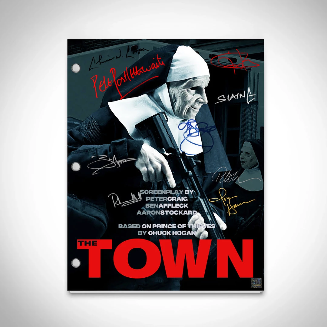 Pay homage to The Town , with this Warner Bros Pictures fully licensed facsimile of the official signed movie script, originally signed by actors Ben Affleck, Rebecca Hall, Jon Hamm, Jeremy Renner, Blake Lively, Titus Welliver, Pete Postlethwaite, Chris Cooper & Slaine , of which is strictly limited to 100 units Worldwide and has been approved and numbered accordingly.