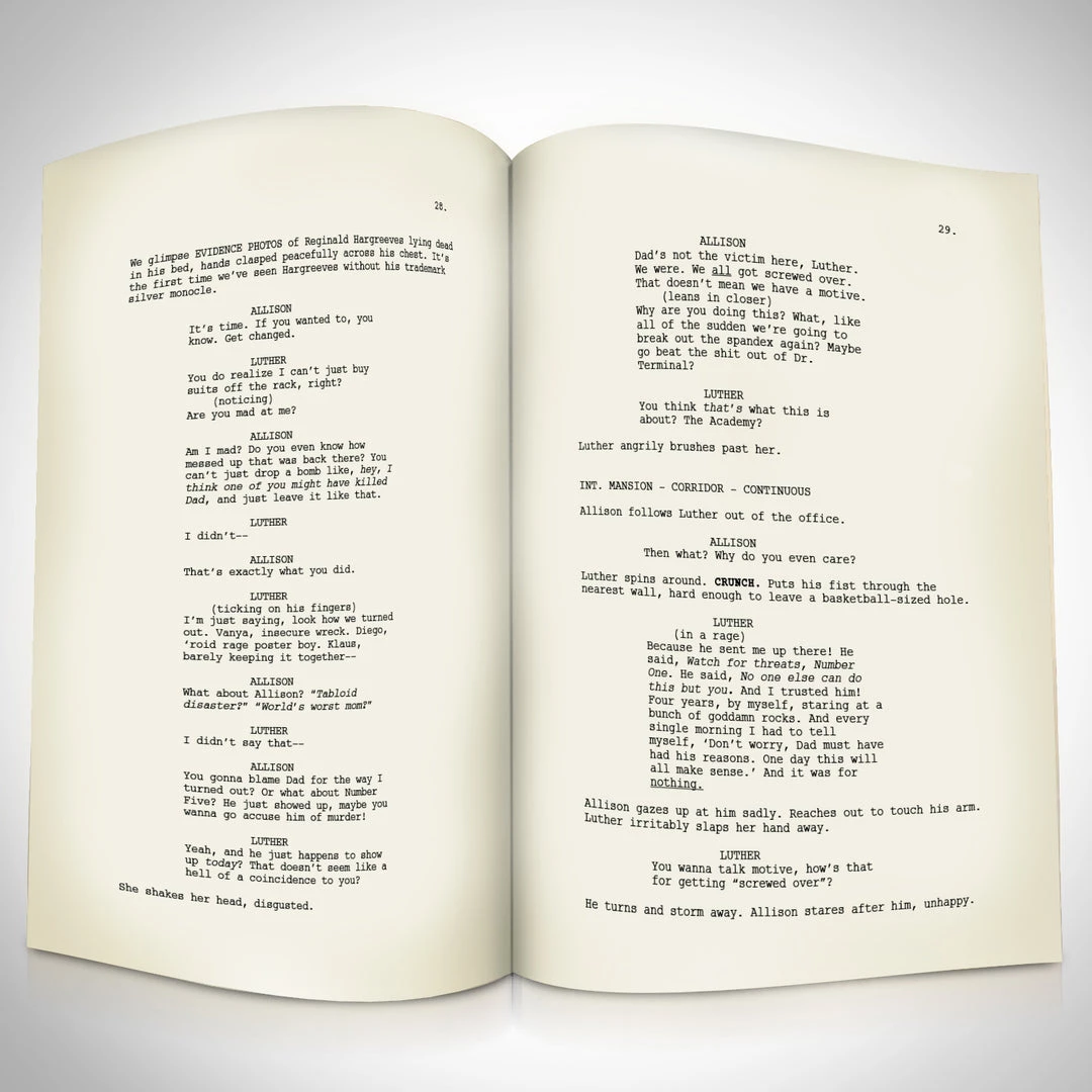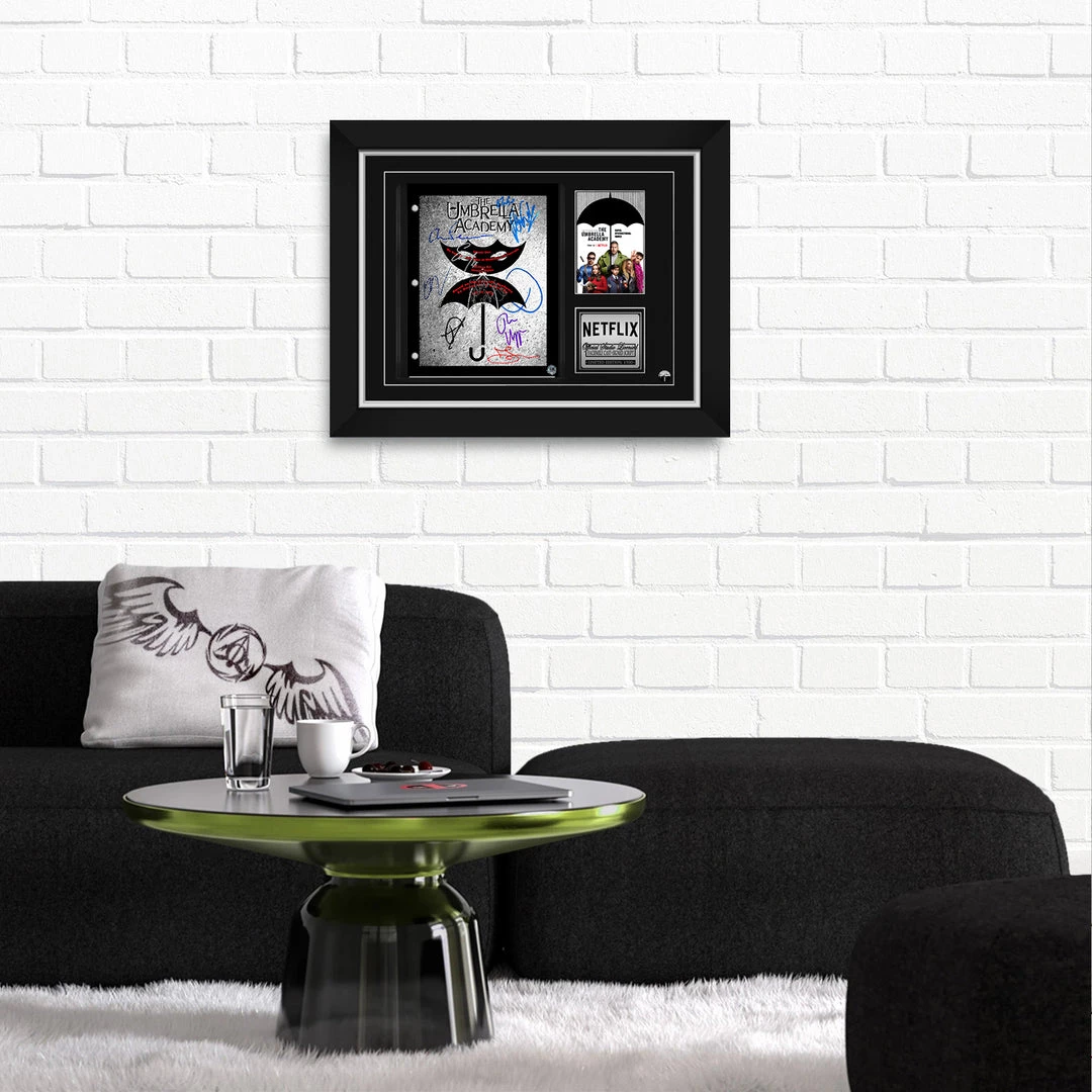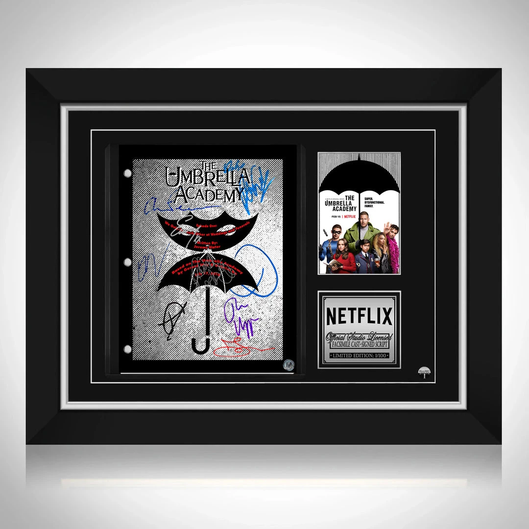 — Collector Grade Proprietary Exclusive VELVET TOUCH water/scratch resistant cover.— Collectible Facsimile of Original Hand-Signed The Umbrella Academy TV Series Script Custom Frame.