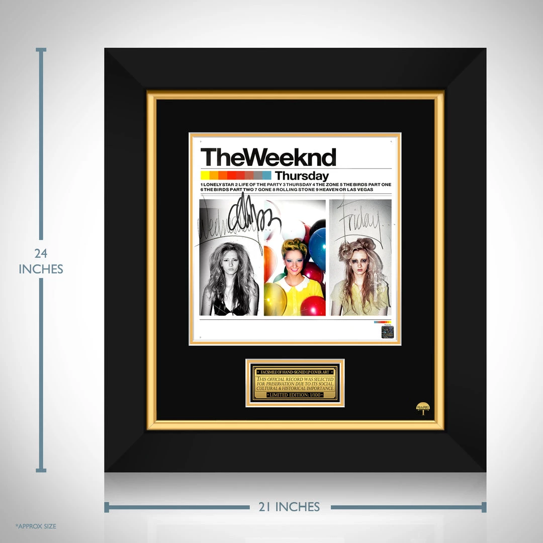 Pay homage to one of the most iconic Canadian musical artist of all time, The Weeknd , with this gallery-framed, officially licensed, limited edition facsimile of the Hand-Signed Thursday LP Cover originally signed by the Weeknd , of which is strictly limited to 100 units Worldwide, and has been approved and numbered accordingly.