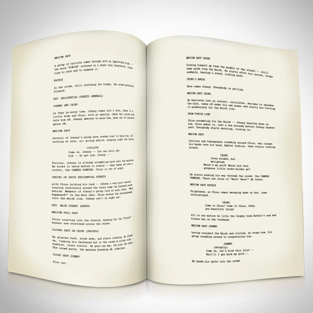 — Collector Grade Proprietary Exclusive VELVET TOUCH water/scratch resistant cover.— Collectible Facsimile of Original Hand-Signed The Wild One movie Script Custom Frame.