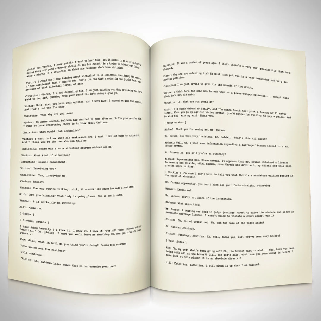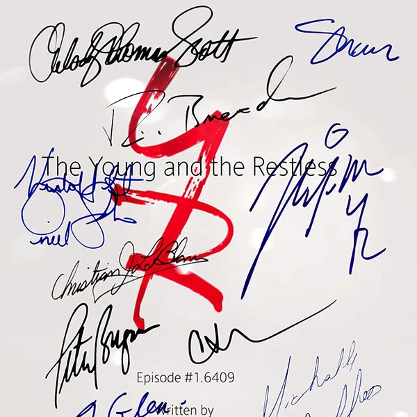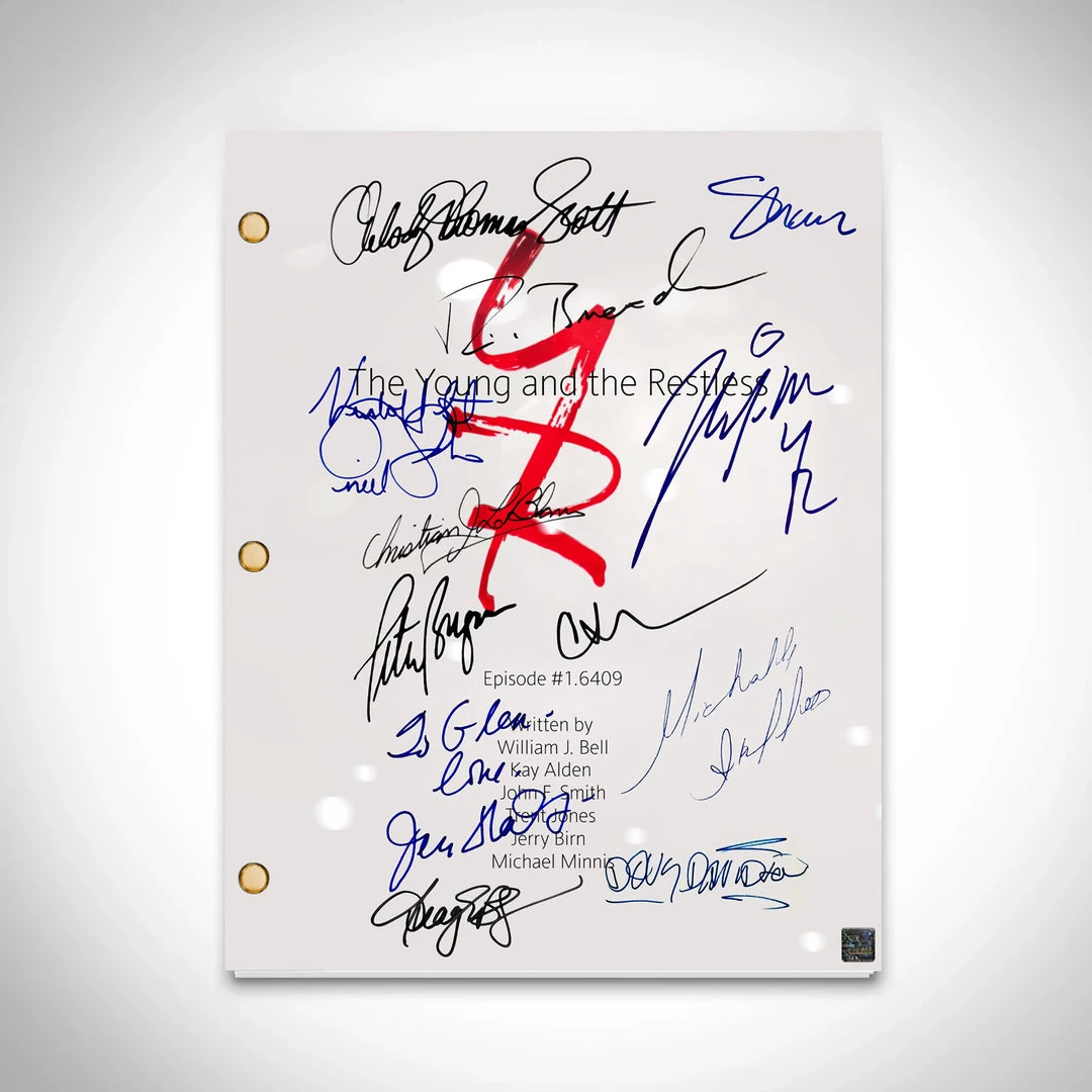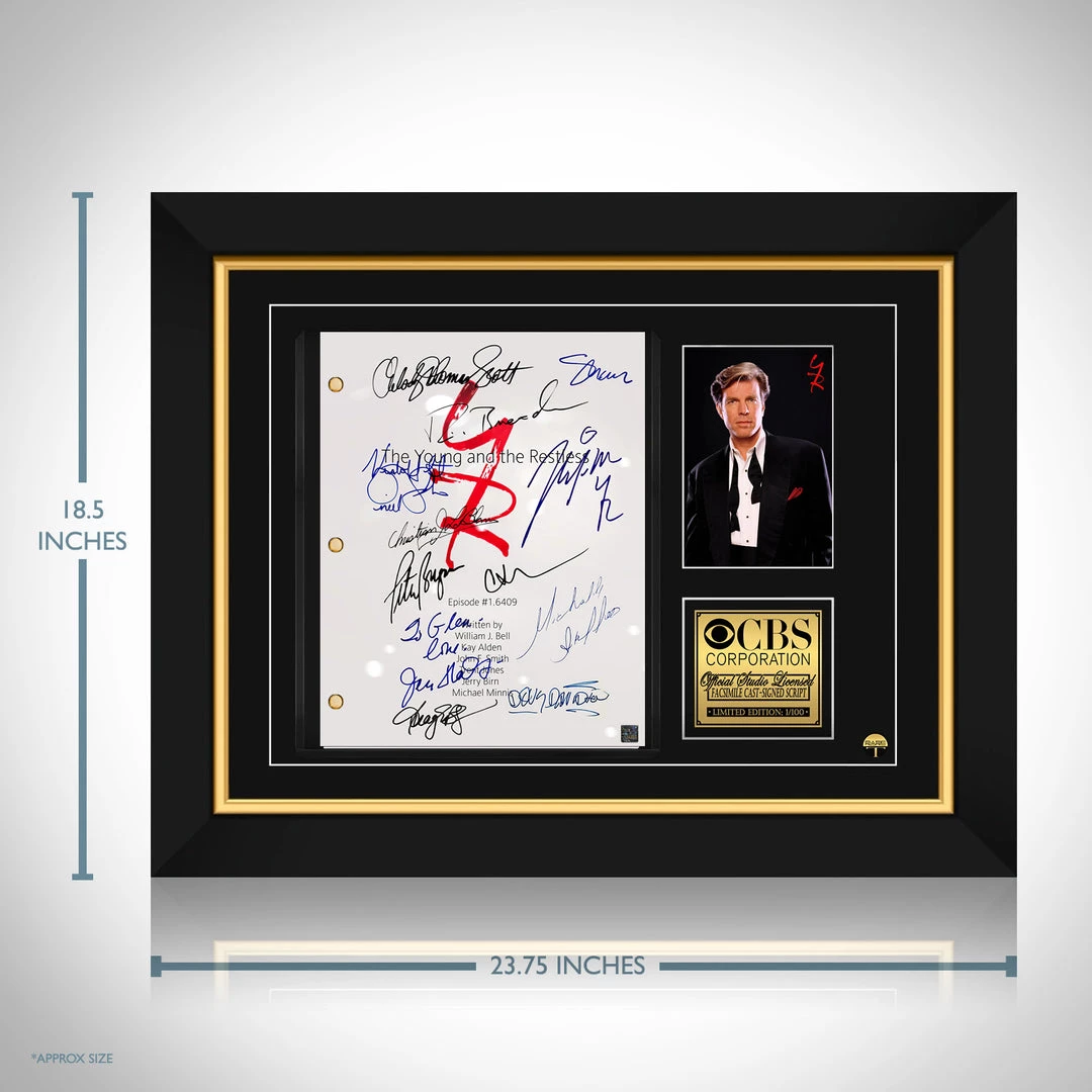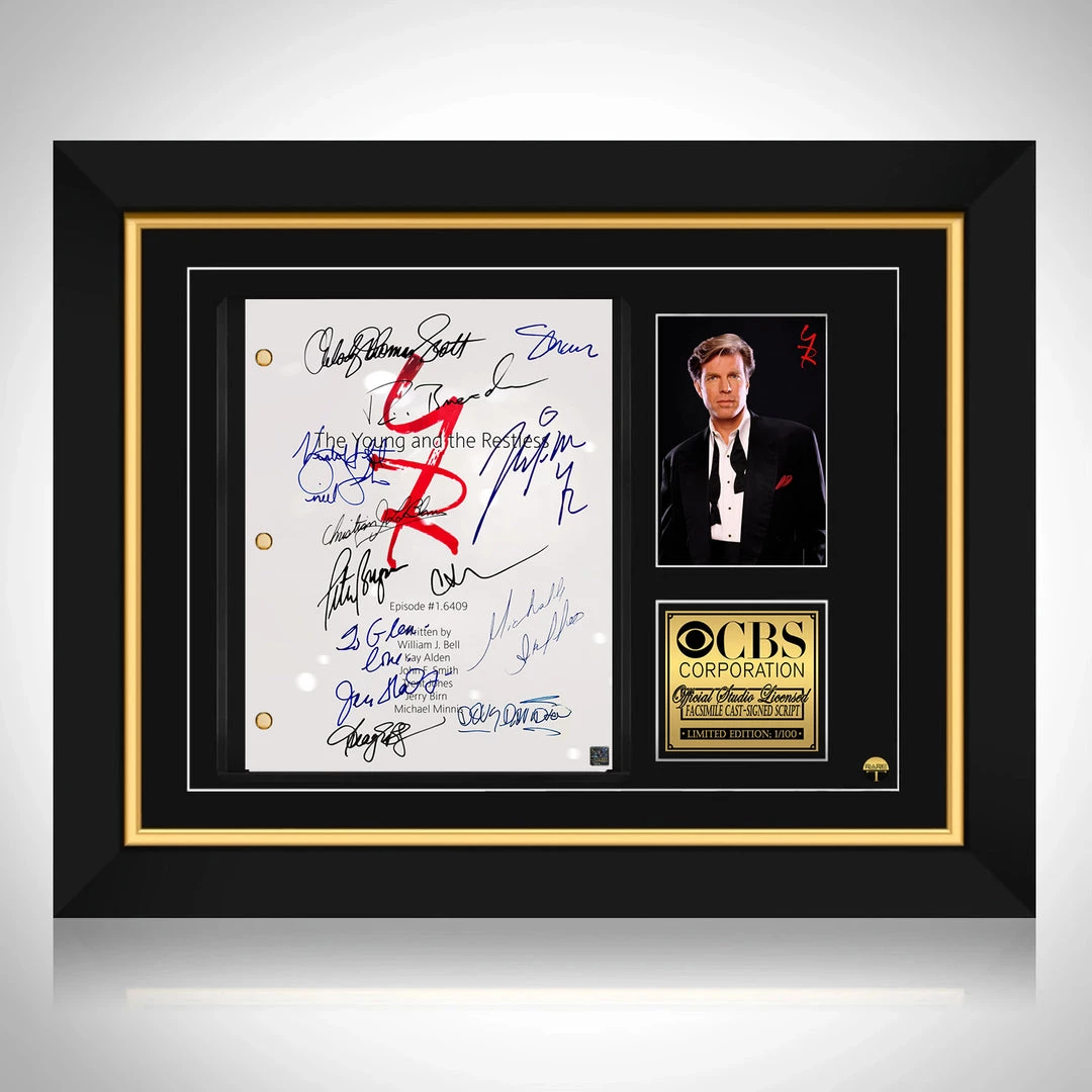Pay homage to The Young And The Restless, with this CBS Corporation fully licensed facsimile of the official signed TV Series script, originally signed by actors Doug Davidson, Eric Braeden, Peter Bergman, Joshua Morrow, Sharon Case, Melody Thomas Scott, Christian Jules Le Blanc, Kristoff St.John, Michelle Stafford, Jess Walton, Tracey E. Bregman, Jeanne Cooper, Camryn Grimes , of which is strictly limited to 100 units Worldwide and has been approved and numbered accordingly.