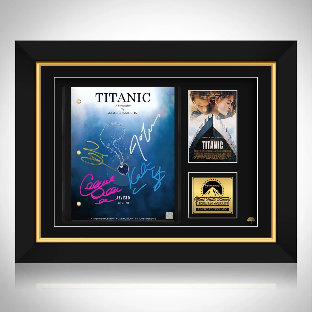 Pay homage to Titanic , with this Paramount Pictures  fully licensed facsimile of the official signed movie script, originally signed by actors Leonardo DiCaprio and Kate Winslet, singer Céline Dion , of which is strictly limited to 100 units Worldwide and has been approved and numbered accordingly.