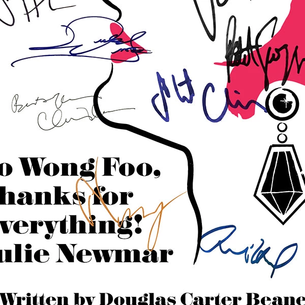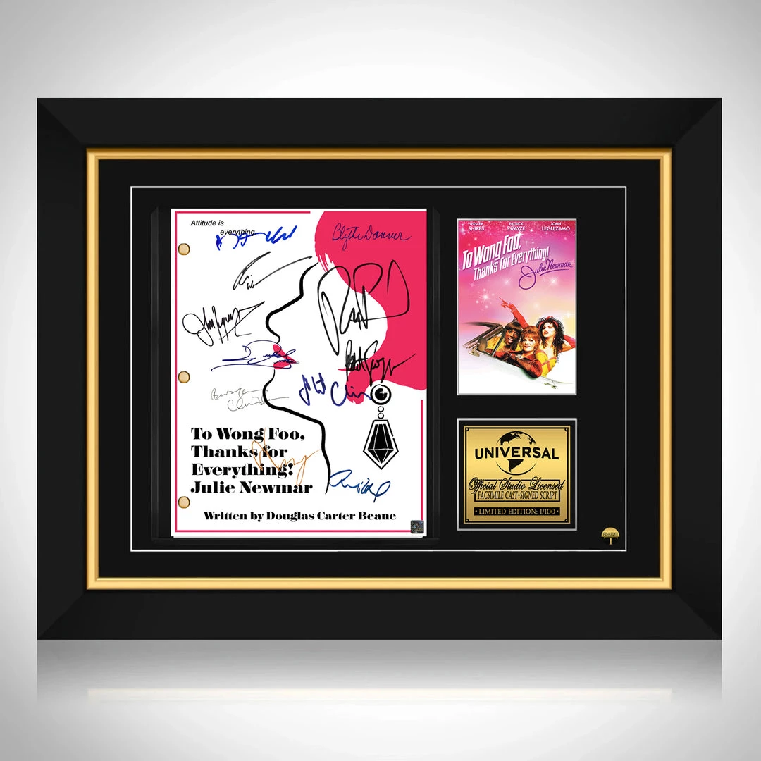 Pay homage to To Wong Foo thanks for everything! Julie Newmar , with this Universal Pictures fully licensed facsimile of the official signed movie script, originally signed by actors Wesley Snipes, Patrick Swayze, John Leguizamo, Stockard Channing, Blythe Danner, Arliss Howard, Chris Penn, RuPaul, Naomi Campbell, Dayton Callie & Robin Williams , of which is strictly limited to 100 units Worldwide and has been approved and numbered accordingly.