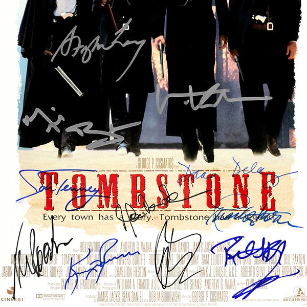 Pay homage to one of the most iconic film of all time, Tombstone, with this gallery-framed, officially licensed, limited edition facsimile of hand-signed movie mini poster, originally signed by Bill Paxton, Billy Zane, Dana Delany, Joanna Pacula, Kurt Russell, Michael Rooker, Robert John Burke, Sam Elliott, Thomas Haden Church, Billy Bob Thornton, Charlton, Heston, Jason Priestley, Jon Tenney, Michael Biehn, Powers Boothe, Robert Mitchum, Stephen Lang & Val Kilmer, of which is strictly limited to 100 units Worldwide, and has been approved and numbered accordingly.