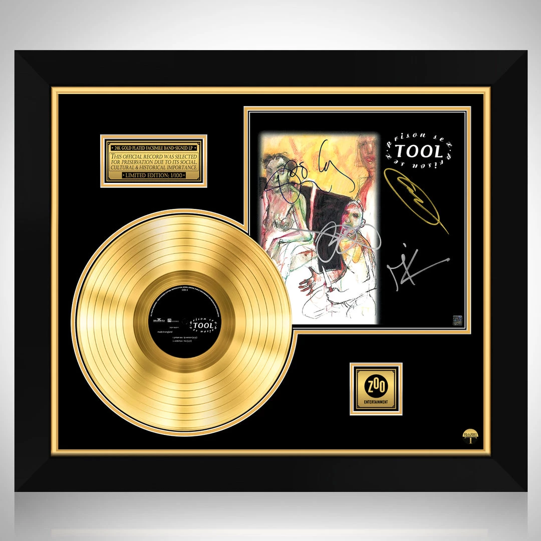 Pay homage to one of the most iconic American rock band of all time Tool , with this gallery-framed, authentic Zoo Entertainment fully licensed facsimile of the official Hand-Signed 24K Gold LP Record and LP Cover Prison Sex Originally signed by Maynard James Keenan, Adam Jones, Danny Carey & Paul D’Amour , of which is strictly limited to 100 units Worldwide and has been approved and numbered accordingly.