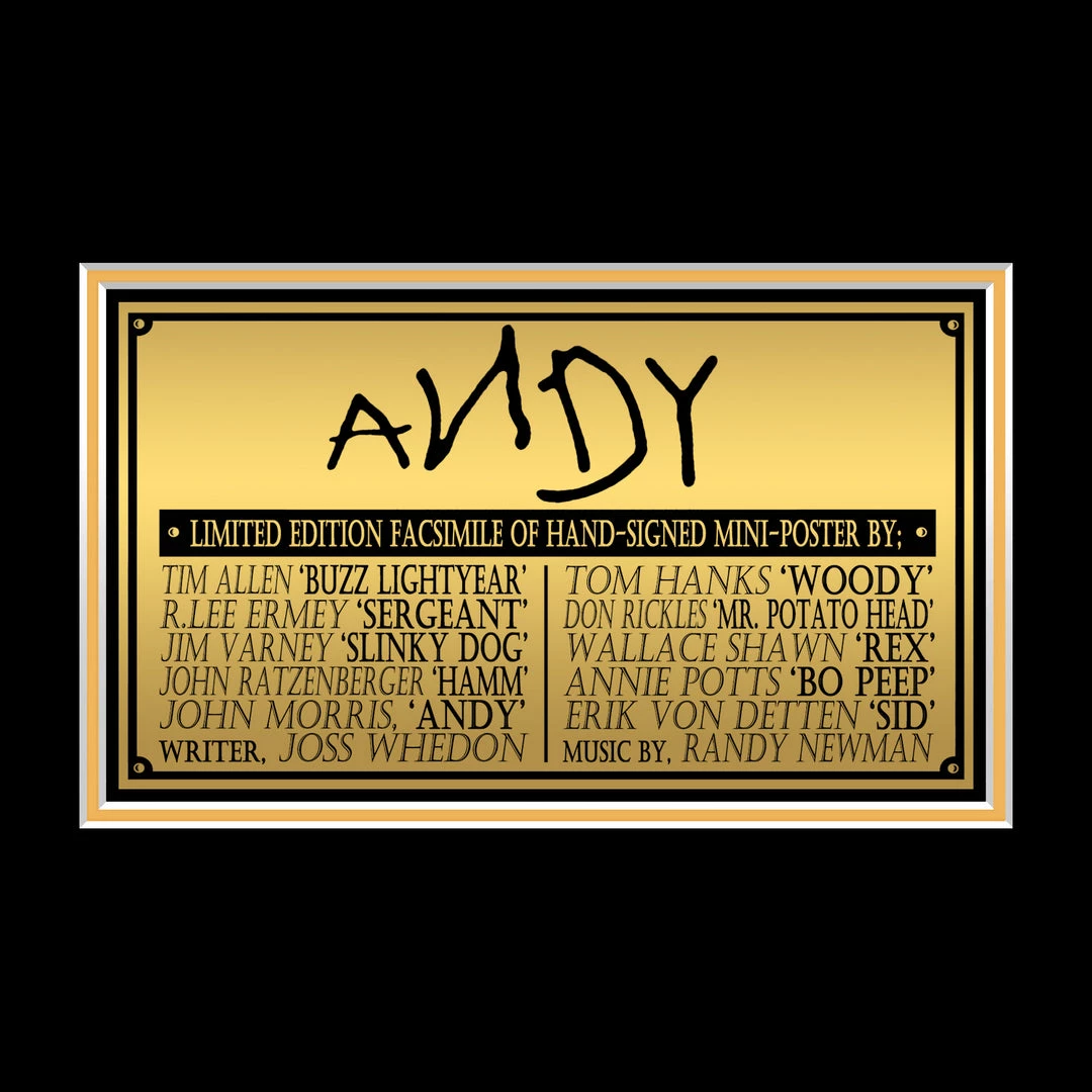Pay homage to one of the most iconic films of all time, Toy Story, with this gallery-framed, officially licensed, limited edition facsimile of hand-signed movie mini poster, originally signed by Tim Allen, R. Lee Ermey, Jim Varney, John Ratzenburger, John Morris, Joss Whedon, Tom Hanks, Don Rickles, Wallace Shawn, Annie Potts, Erik Von Detten and Randy Newman, of which is strictly limited to 100 units Worldwide, and has been approved and numbered accordingly.