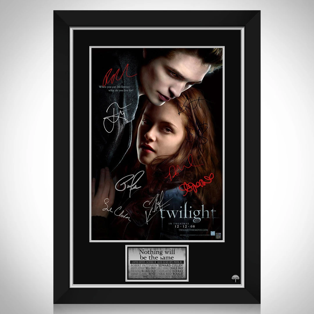 Pay homage to one of the most iconic films of all time, Twilight, with this gallery-framed, officially licensed, limited edition facsimile of hand-signed movie mini poster, originally signed by Robert Pattinson, Kristen Stewart, Peter Facinelli, Sarah Clarke, Kellan Lutz, Billy Burke, Taylor Lautner, Nikki Reed and Ashley Green, of which is strictly limited to 100 units Worldwide, and has been approved and numbered accordingly.