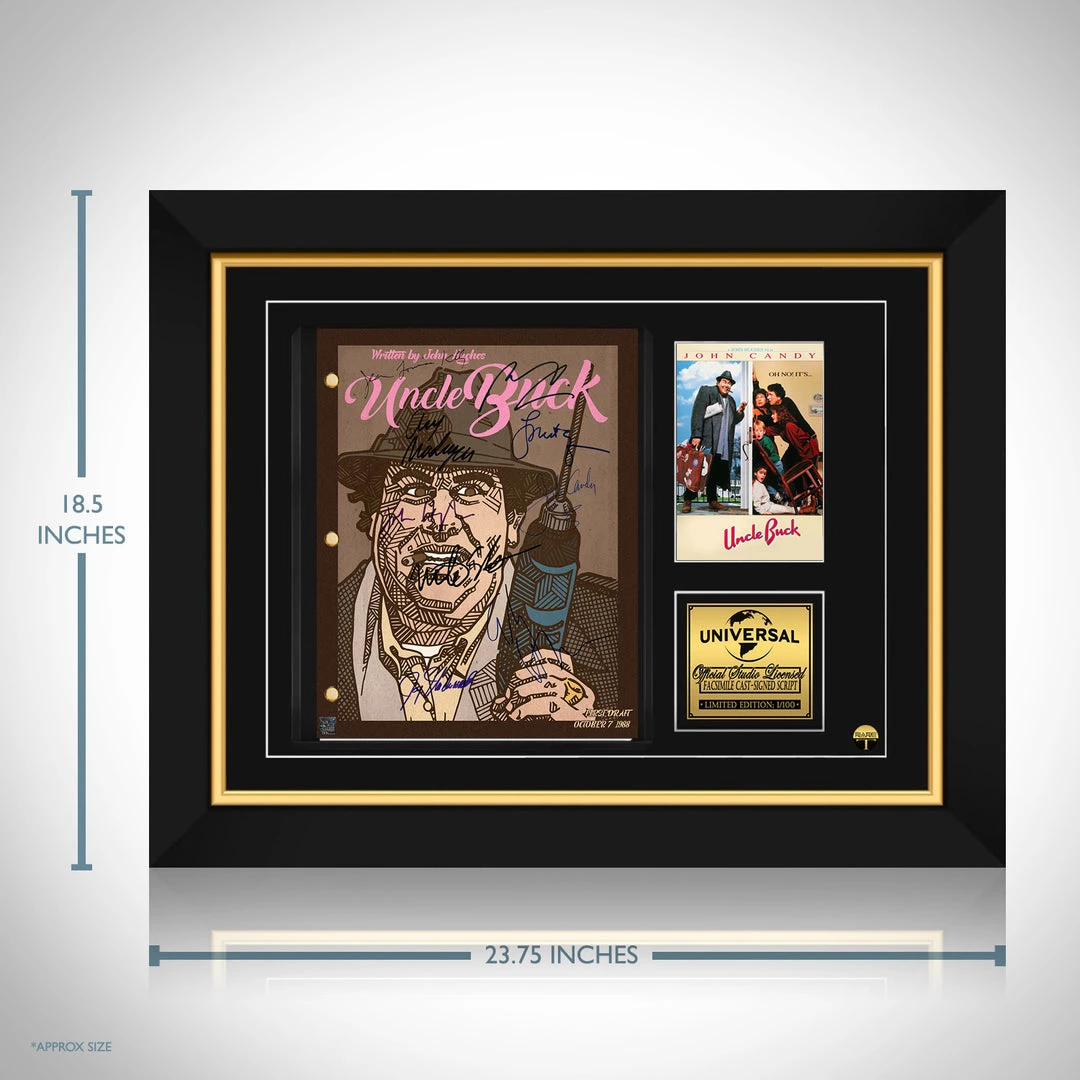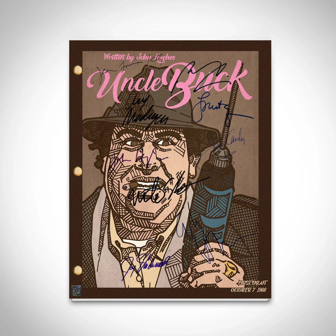 Pay homage to Uncle Buck , with this Universal Pictures fully licensed facsimile of the official signed movie script, originally signed by actors John Hughes, John Candy, Jean Louisa Kelly, Gaby Hoffman, Macaulay Culkin, Amy Madigan, Laurie Metcalf, Jay Underwood & Mike Starr , of which is strictly limited to 100 units Worldwide and has been approved and numbered accordingly.