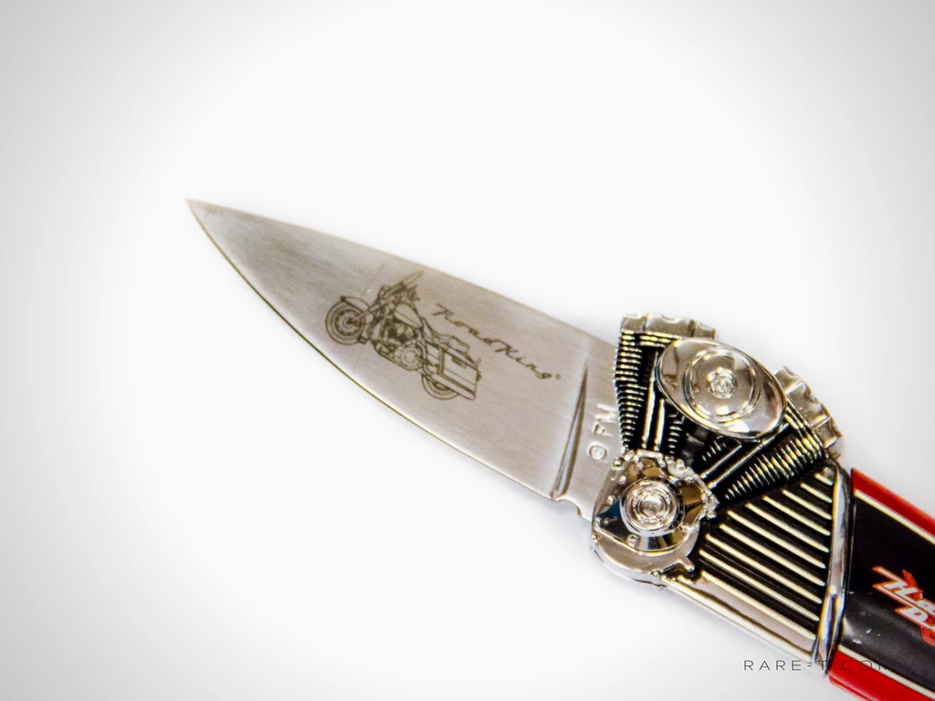 8 inches long open – Stainless steel blade features the etched iconic motorcycle.