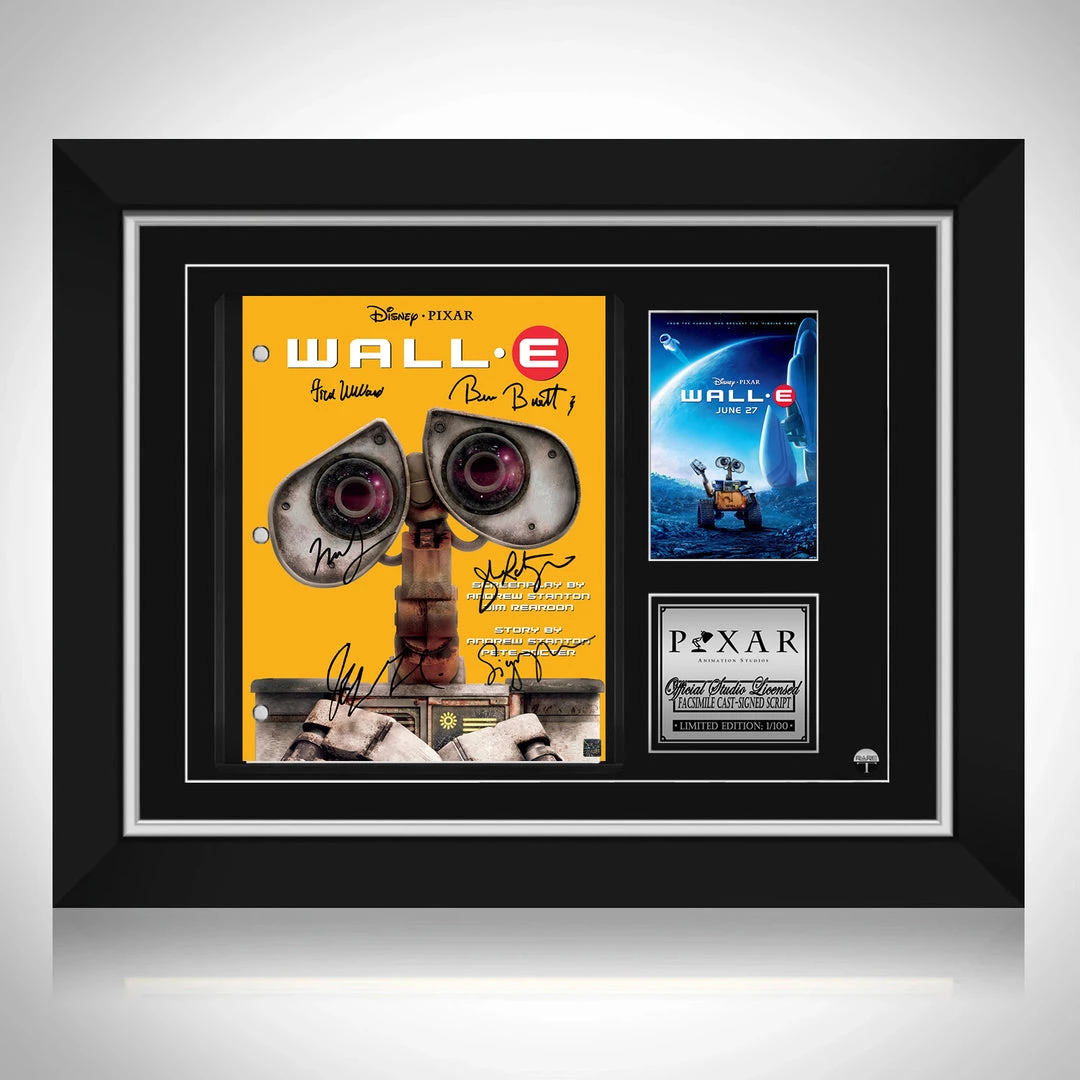 Pay homage to Wall-E , with this Disney Studios fully licensed facsimile of the official signed movie script, originally signed by actors Ben Burtt, Elissa Knight, Jeff Garlin, Fred Willard, John Ratzenberger, Kathy Najimy & Sigourney Weaver , of which is strictly limited to 100 units Worldwide and has been approved and numbered accordingly.