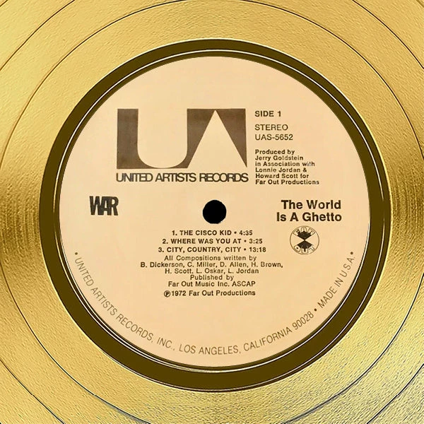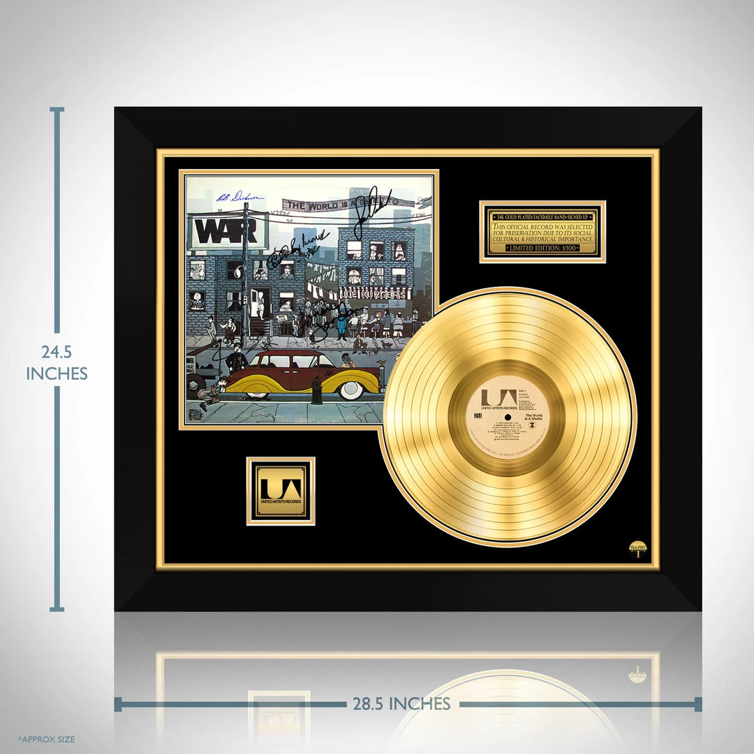 Pay homage to one of the most iconic American funk/rock/soul band of all time War , with this gallery-framed, authentic United Artists Records fully licensed facsimile of the official Hand-Signed 24K Gold LP Record and LP Cover The World Is a Ghetto Originally signed by Howard Scott, Lonnie Jordan, Harold Brown, Lee Oskar & B.B. Dickerson , of which is strictly limited to 100 units Worldwide and has been approved and numbered accordingly.