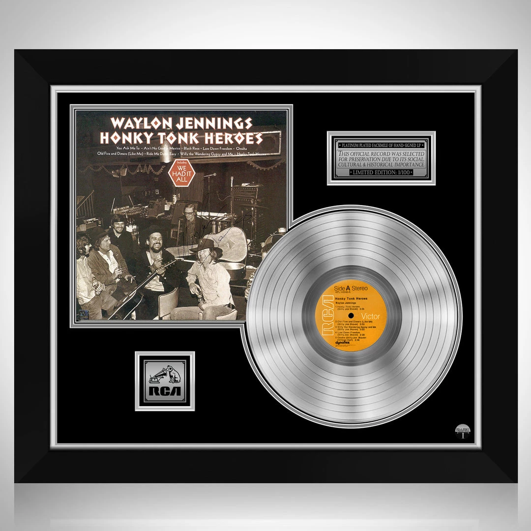 Pay homage to one of the most iconic American singer, songwriter, and musician of all time Waylon Jennings , with this gallery-framed, authentic RCA Records fully licensed facsimile of the official Hand-Signed Platinum Plated LP Record and LP Cover Honky Tonk Heroes Originally signed by Waylon Jennings , of which is strictly limited to 100 units Worldwide and has been approved and numbered accordingly.