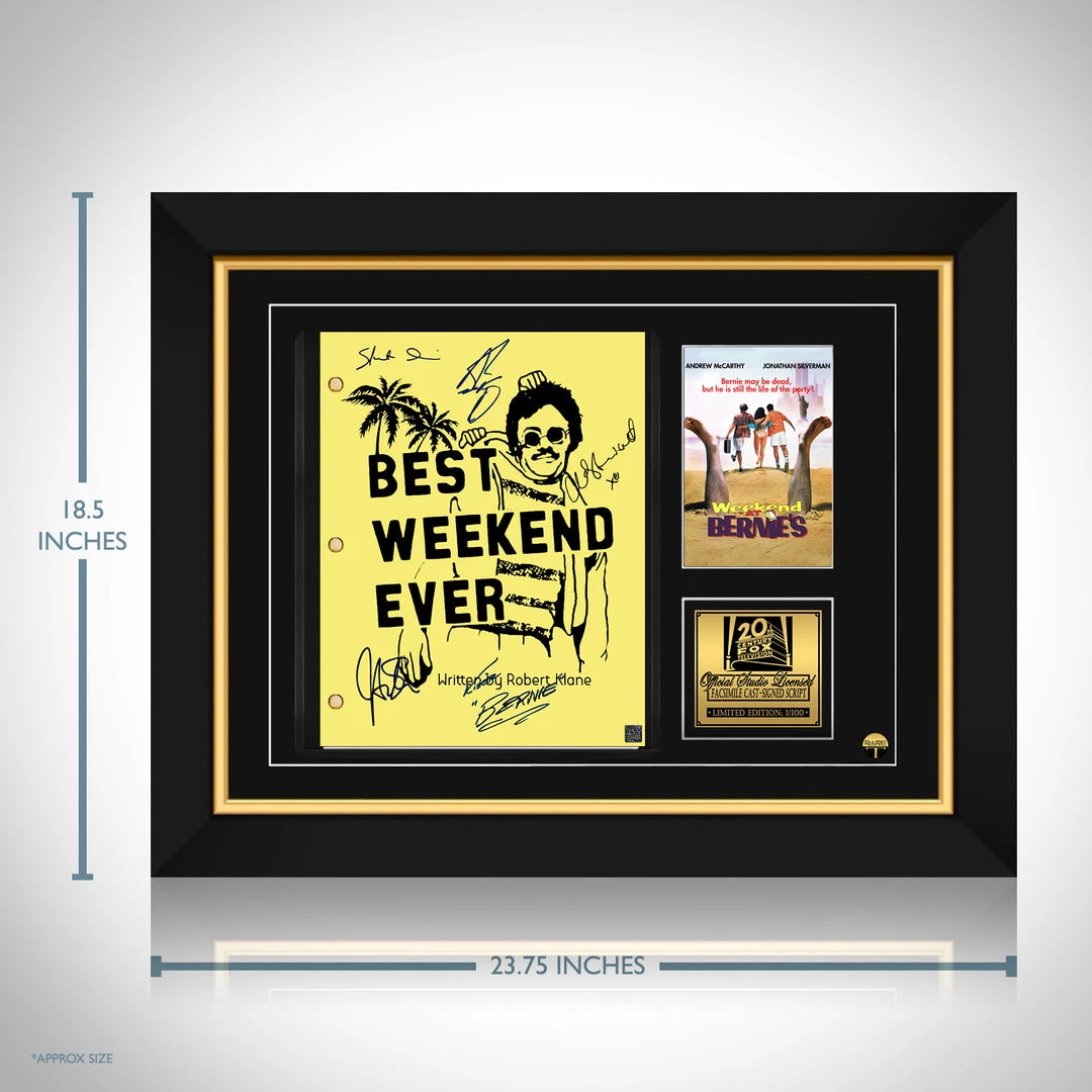 Weekend at Bernie’s Script Limited Signature Edition Studio Licensed Custom frame Pay homage to Weekend at Bernie’s , with this 20th Century Fox fully licensed facsimile of the official signed movie Transcript , originally signed by actors Andrew McCarthy, Jonathan Silverman, Catherine Mary Stewart, Terry Kiser & Skeet Ulrich , of which is strictly limited to 100 units Worldwide and has been approved and numbered accordingly.