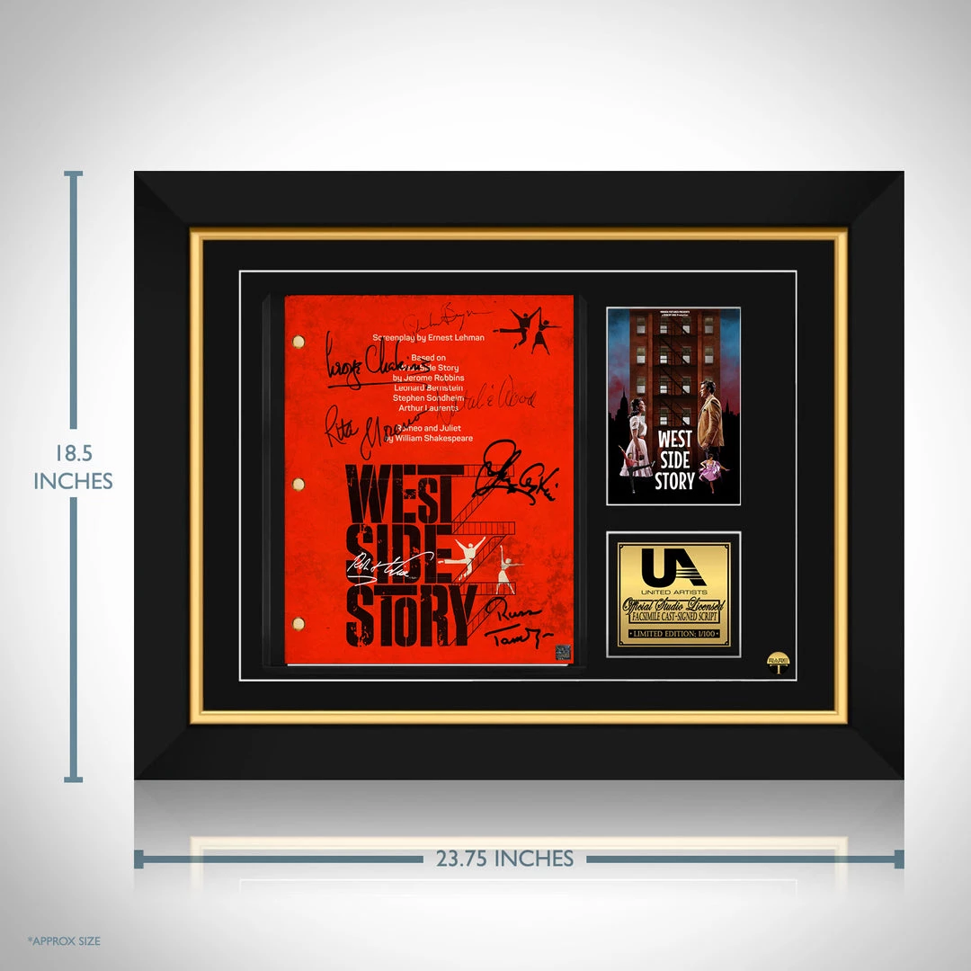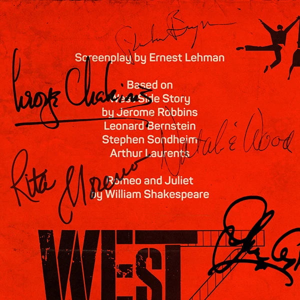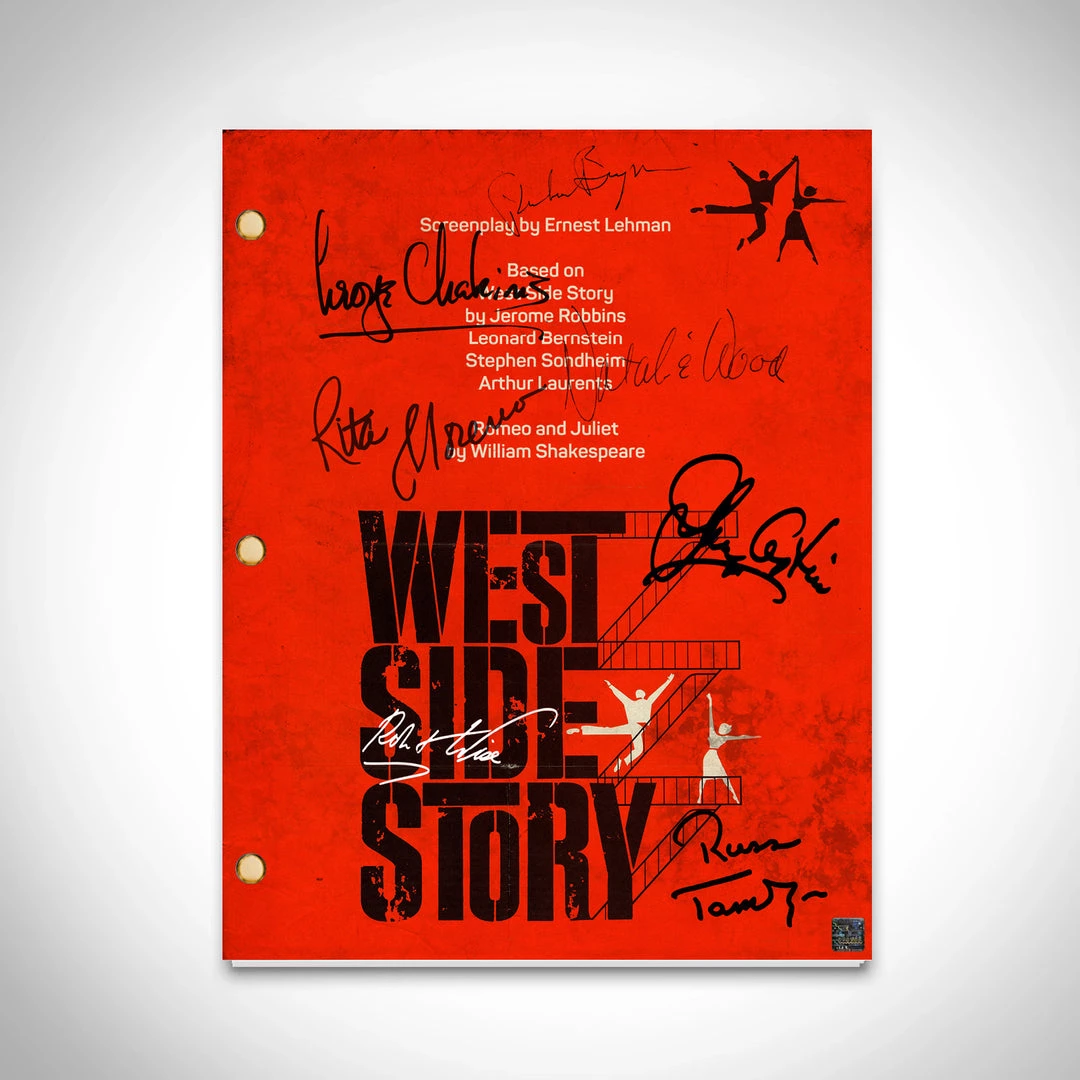 Pay homage to West Side Story 1961 , with this United Artists fully licensed facsimile of the official signed movie Transcriptย , originally signed by actors Natalie Wood, Richard Beymer, Rita Moreno, George Chakiris, Russ Tamblyn, John Astin & Robert Wise , of which is strictly limited to 100 units Worldwide and has been approved and numbered accordingly.