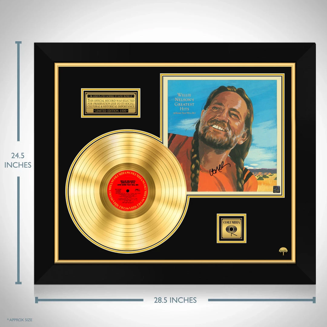 Pay homage to one of the most recognized artists in country music, Willie Nelson, with this gallery-framed, authentic, Columbia Records fully licensed facsimile of the official Hand-Signed 24k Gold Plated LP Record and LP Cover Greatest Hits originally signed by musician, actor & activist Willie Nelson, of which is strictly limited to 100 units Worldwide and has been approved and numbered accordingly.